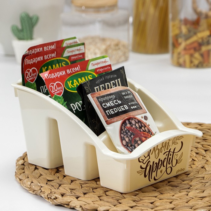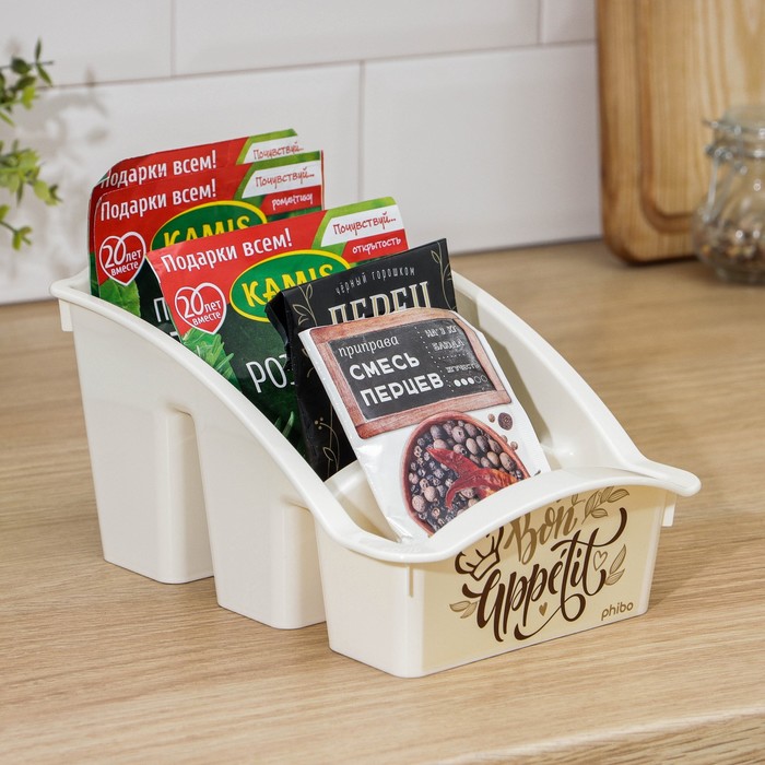 Габариты: 22 x 15 x 12 Страна: Россия В боксе: 32 шт Состав: Пластик Материалы: пластик Фасовка: по 1 шт Индивидуальная упаковка: Без упаковки Габариты товара: 22,3 см × 15 см × 12 см Сертификат: СТР Набор: Нет Цвет: МИКС Форма: Прямоугольная Длина, см: 15 Ширина, см: 12 Высота, см: 12 В наборе, шт.: 1 Количество секций: 3 Рисунок: Да Крышка: Нет Материал: Пластик, Полипропилен Герметичная крышка: Нет Пищевой пластик: Да Назначение: Для сыпучих, Универсальная Особенности: Без особенностей Разделитель: Да Органайзер для хранения специй, приправ и пряностей позволяет отсортировать пакетики со специями. Благодаря этому легко найти искомый пакет и поддерживать порядок в кухонном шкафу. Стенки лотка снабжены высокими бортиками. Практичный органайзер пригодится в любом хозяйстве и поможет аккуратно хранить все приправы в одном месте. Размер корзинки выверен под стандартный размер пакетика со специями, которые в большинстве своем представлены на полках магазинов, а потому отделения идеально подходят для их устойчивого хранения. Одновременно такой органайзер не занимает много места и поместится на любой кухонной полочке. Преимущества: