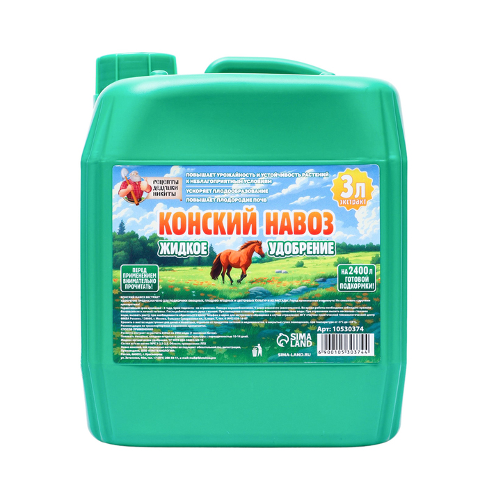 Натуральная сила конского навоза в удобной форме! Экстракт "Рецепты дедушки Никиты" 3л — концентрированное органическое удобрение для рекордных урожаев. 100% натуральный состав без химических добавок подходит даже для самых требовательных культур.