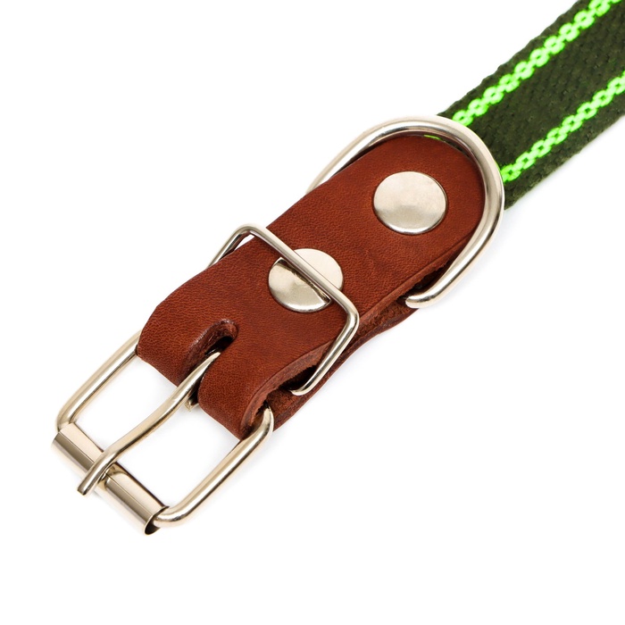 Ошейник полностью изготовлен из качественных материалов, таких как хлопок и полиэстер. Ошейник для собаки из брезента имеет в составе хлопок и полиэстер в соотношении 50% - 50%, что обеспечивает ошейнику высокую прочностью и долговечность.