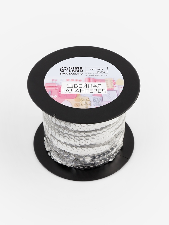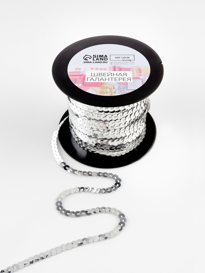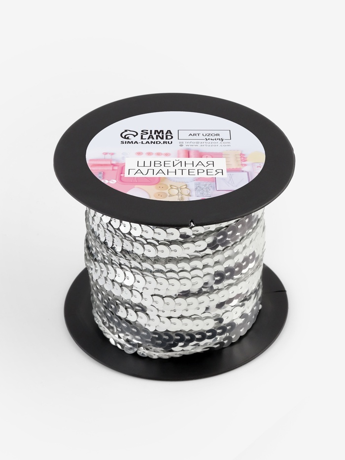 Серебряная нить с пайетками создаёт эффект непрерывного мерцания, напоминающий зимний иней. Готовые ряды ровных блёсток экономят время при декоре, сохраняя идеальный интервал между элементами. Девяносто одного метра хватит на масштабные проекты: отделку сценических костюмов, свадебного декора или новогоднего интерьера.
