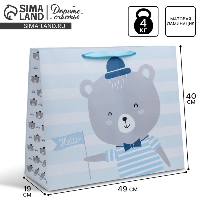 Производитель: Дарите Счастье; Габариты: 49 x 40 x 0,3; Страна: Китай; В боксе: 100 шт; Состав: Бумага; Материалы: бумага; Фасовка: по 1 шт; Индивидуальная упаковка: Пакет (БОПП, полиэтилен, ПВХ, дой-пак); Габариты товара: 49 см × 19 см × 40 см; Сертификат: ЕАС; Цвет: Голубой, Серый; Для кого: Для мальчика; Плотность, г/м²: 210; Допустимый вес вложения, г: 4000; Тематика: Детская; Тематика праздника: Универсальная тематика, Рождение ребёнка; Адресат: Без адресата; Материал: Бумага; Отделка пакета: Ламинация; Вид ручки: Ручка-лента; Особенности: Без особенностей; Дизайн: С рисунком, надписью
