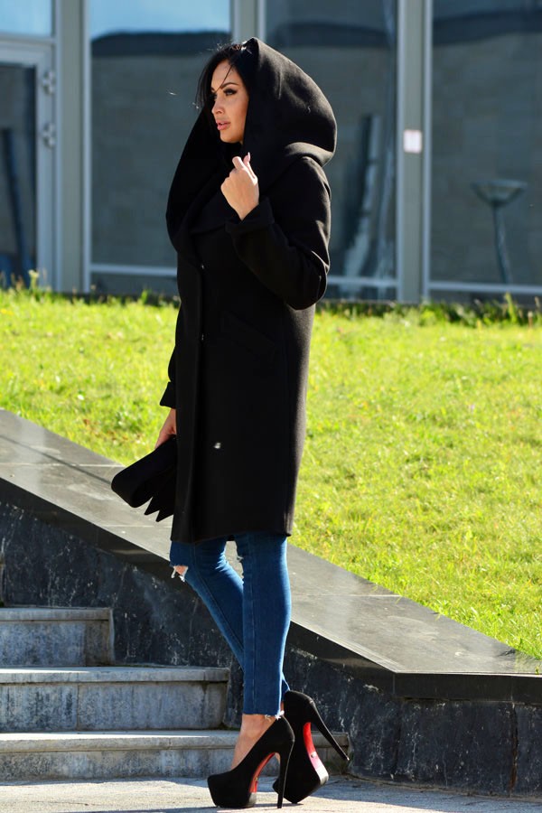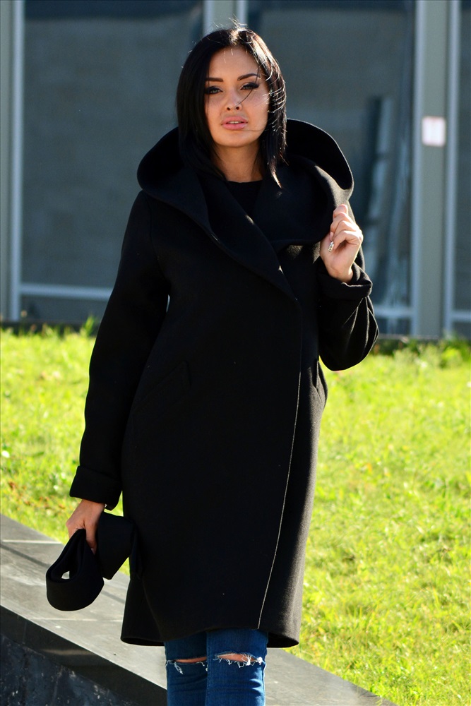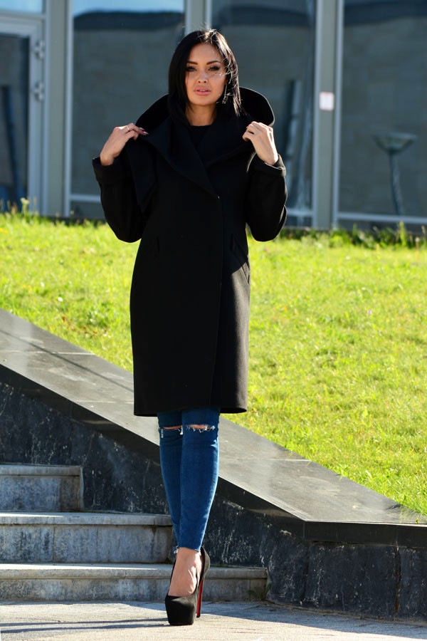 Модель: 18910; Материал: кашемир; Цвет: черный Описание: Пальто женское демисезонное с капюшоном длина по спинке -  93см длина рукава+манжет - 67см длина плеча - 10 см силуэт - прямой к низу заужен застежка  - 3 пришивные кнопки пояс        - есть карман    - прорезные с настрочной листочкой отделка   - отстрочка гарус состав ткани :  60% шерсти