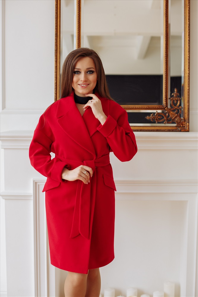Модель: 20808; Материал: кашемир; Цвет: красный Описание: Пальто демисезонное. Силуэт прямой. Застежка двубортная на три пришивные кнопки. Спинка со средним швом. Рукав по типу кимоно, спущенный. Воротник английский, с большим отложным воротником и большими лацканами. Карман - листочка с клапаном. Пояс есть. Длина рукава от горловины - 72 см. Длина изделия по спинке - 98 см.