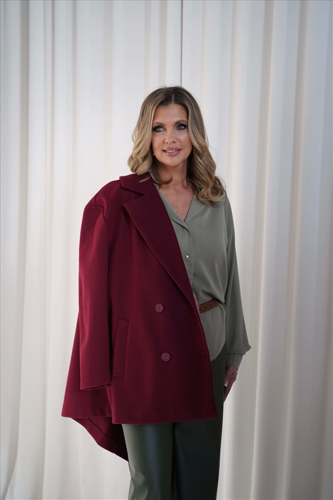 Цвет: бордовый Артикул: Б12485-7. Тип ткани: смесовая.  Состав: 50% шерсть, 30% вискоза, 20% полиэстер. Материал: смесовая шерсть. Цвет: бордовый.  Принт: отсутствует.  Вид застежки: пуговицы. Силуэт: оверсайз. Карманы: есть.  Подкладка: отсутствует. Температурный режим: от -5 °C до +10 °C  Декоративные элементы: отсутствуют. Длина по спинке от верхней точки плеча: 44-48/ 80 см, 50-52/ 81 см. Размер изделия на модели: 44 Рост модели: 168 см. Пальто выполнено в стиле оверсайз, что обеспечивает комфорт и свободу движений. Его выразительный двубортный английский воротник придаёт образу элегантность. Это пальто станет настоящей находкой для женщин, которые ценят удобство и стиль. Его потрясающий бордовый цвет легко сочетается с самыми разнообразными вещами и необычными аксессуарами. Однако не забывайте о гармонии оттенков в вашем наряде. Уход за изделием: ручная стирка до 30 градусов; нельзя отбеливать; отжим запрещён; гладить при t не более 110 С; гладить с изнанки. Внимание! Рекомендуем ориентироваться на размерную сетку и выбирать свой привычный размер, согласно размерной таблице. *Допуск отклонения длины при массовом производстве 1-3 см является нормой.