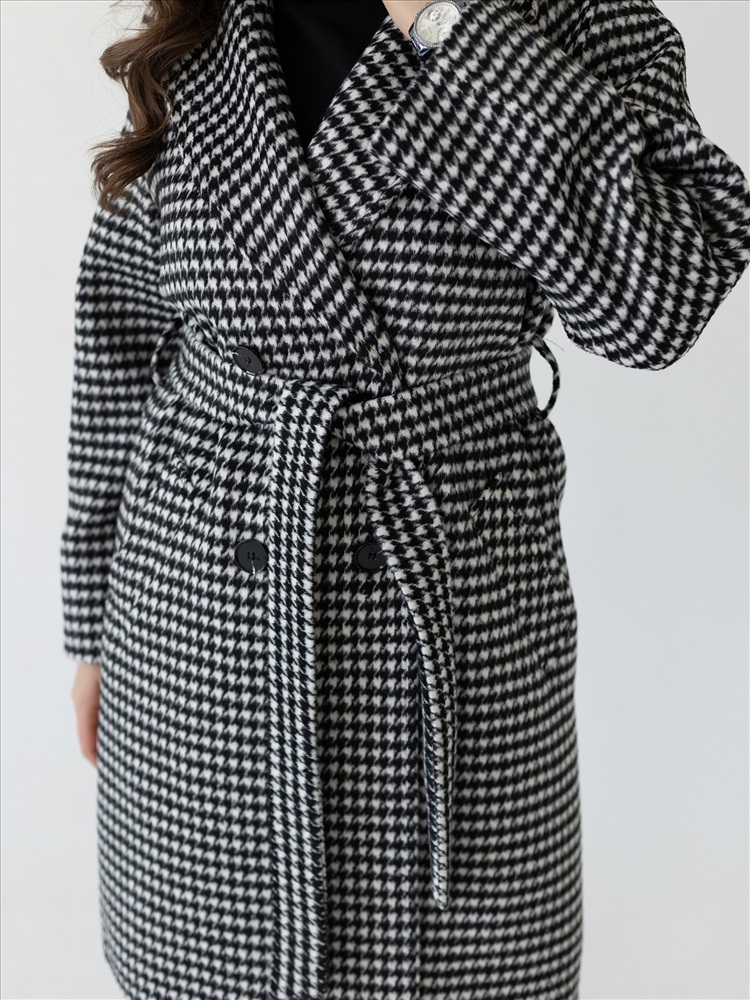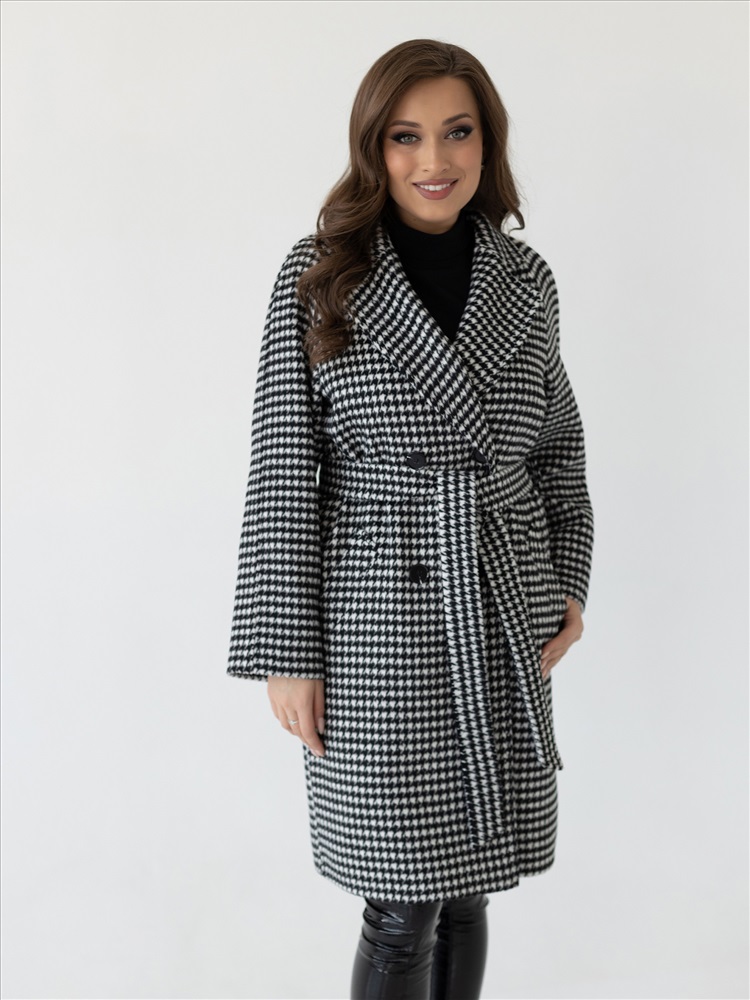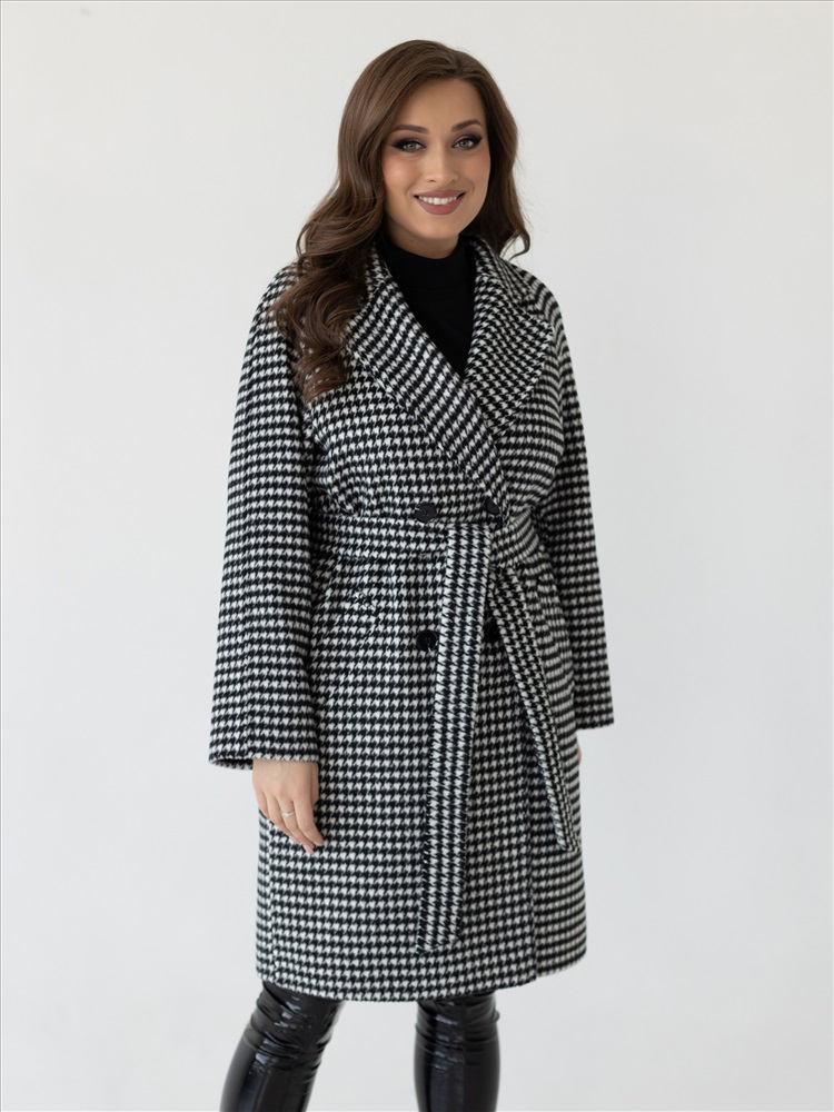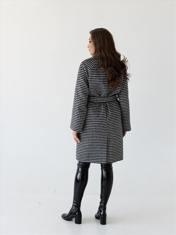 Модель: 23220; Материал: Ворсовая ткань; Цвет: черно-белый; Состав: 70% шерсть, 30% полиэстер Описание: Пальто женское демисезонное Прямой силуэт,двубортное Рукав-реглан, подгиб низа рукава 11 см, можно сделать отворот Отстрочка по верхним швам рукавов,лацканам и воротнику Пояс есть Длина изделия по спинке - 100 см Длина рукава от горловины - 73,5 см
