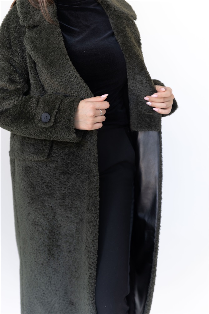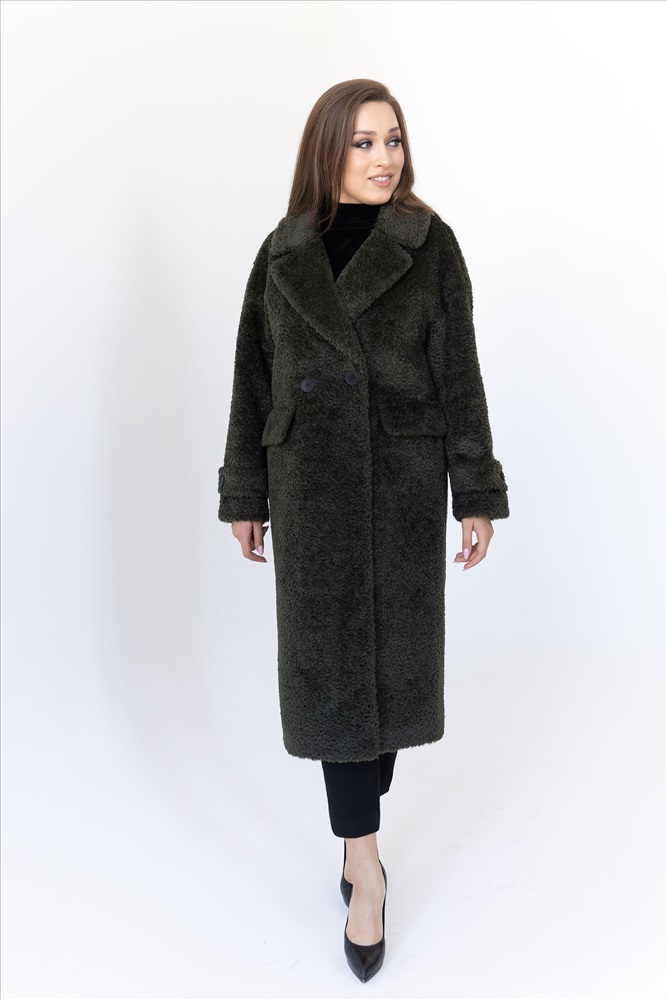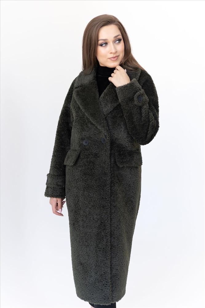 Модель: 23777; Материал: Искусственный мех; Цвет: хаки+черный Описание: Пальто женское демисезонное Прямой силуэт со спущенной проймой и отделкой из кожи на нижних и внутренних деталях Воротник английский Пояса нет Длина по спинке - 115 см Длина рукава - 72 см
