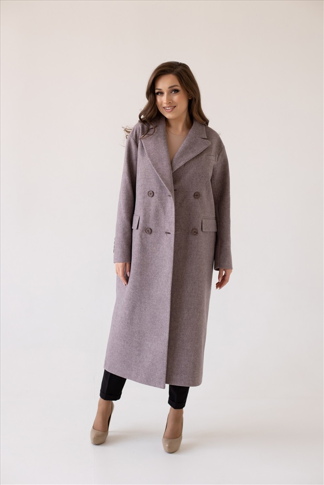 Двубортное пальто с мужским силуэтом и дополнительным объемом в плечах