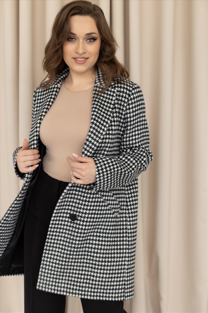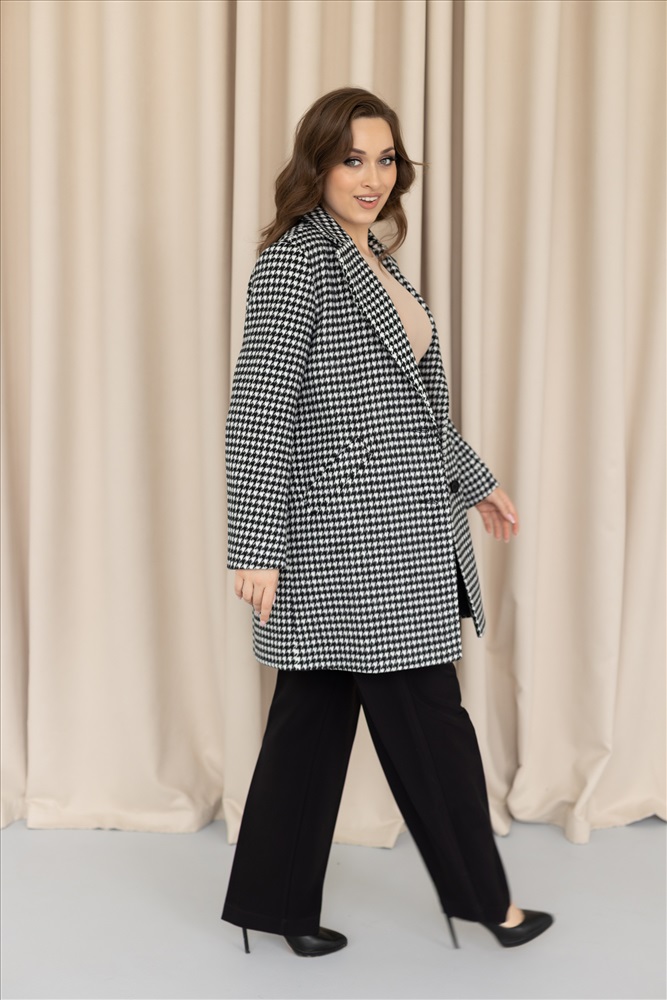 Модель: 24720; Материал: рубчик; Цвет: черно-белый Описание: Пальто женское демисезонное. Силуэт прямой с втачным рукавом. Воротник английский. Рукав 2-шовный втачной. Застёжка на 2 петли и пуговицы. Длина рукава с плечом 72 см. Длина изделия по спинке 90 см.