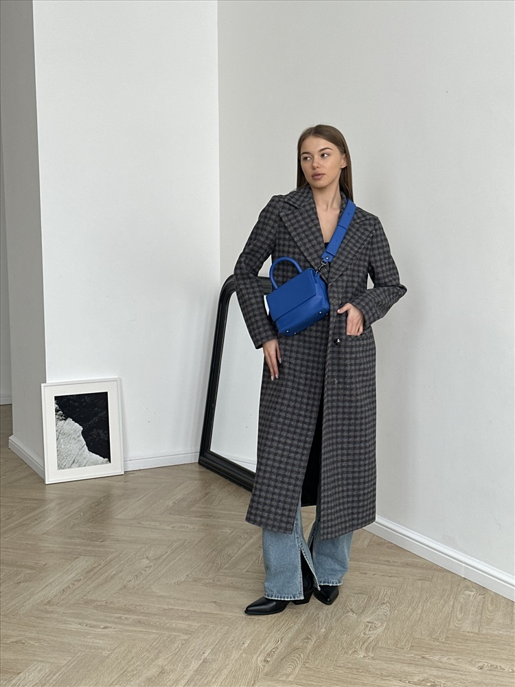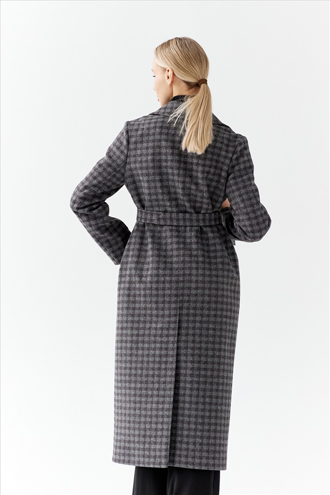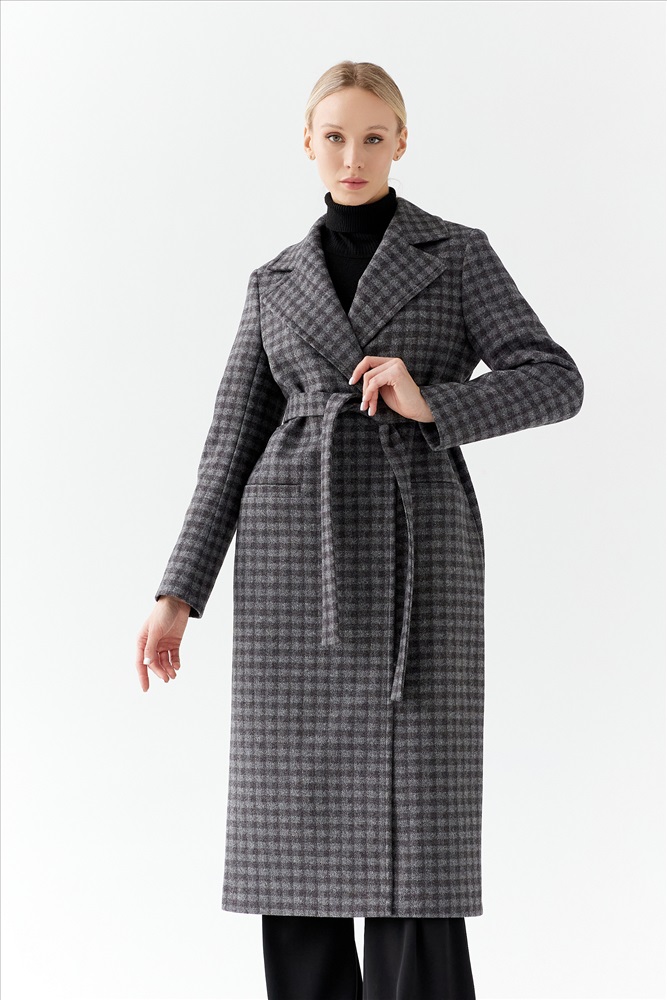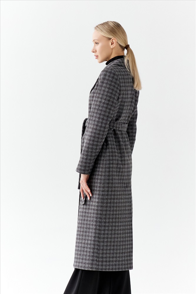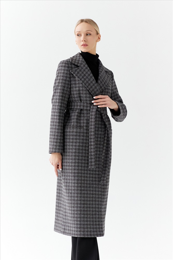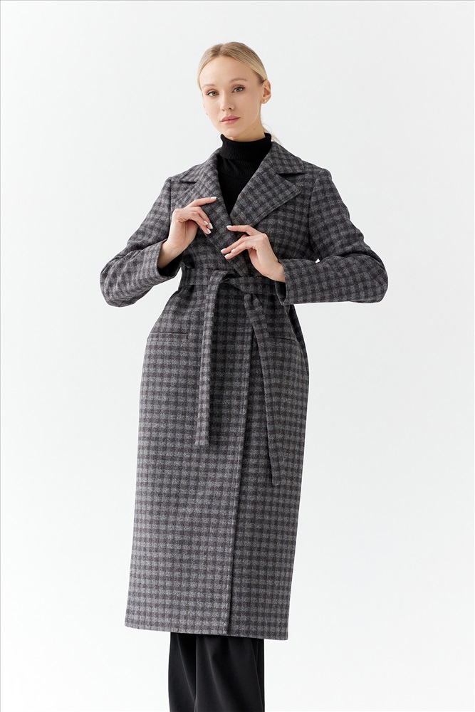 Модель: 24770; Материал: Ворсовая ткань; Цвет: черно-серый; Параметры модели: 86-62-92, 176; Размер на модели: 42 Описание: Пальто женское демисезонное. Силуэт прямой с втачным рукавом. Воротник английский. Рукав 2-шовный втачной. Застёжка на 4 пришивные кнопки. Длина рукава с плечом 70 см. Длина изделия по спинке 120 см.