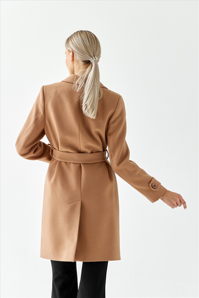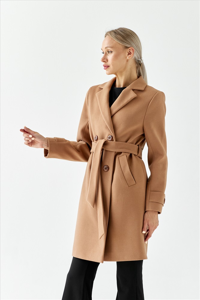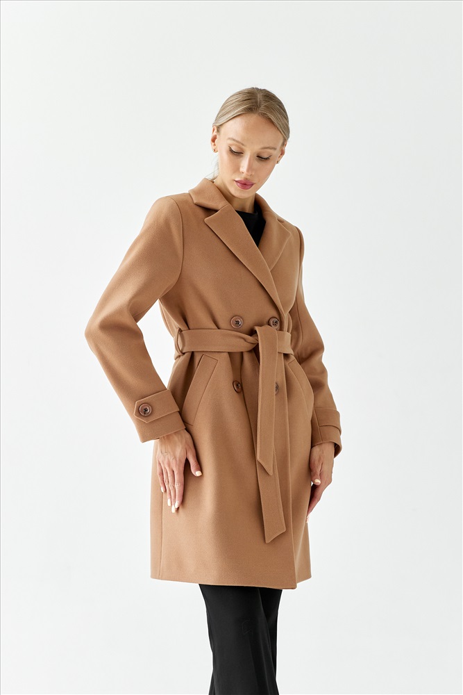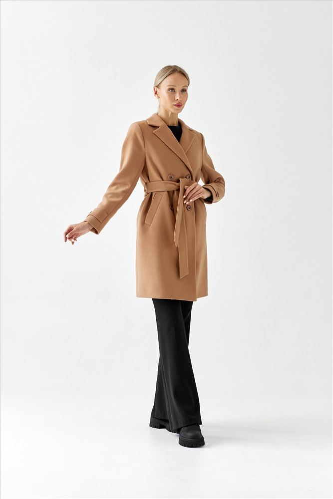 Модель: 25570; Материал: кашемир; Цвет: кэмел; Состав: 70% шерсть, 30% полиэстер; Параметры модели: 86-62-92,176; Размер на модели: 42 Описание: Пальто демисезонное Силуэт –прямой с втачным рукавом рукавом. Застёжка –двубортная на 4 пуговицы и 1пуговицу полудержатель . Полочка - с вытачкой под воротником и карманами с прорезной листочкой Спинка –со средним швом и шлицей. Воротник –английский. Пояс-есть. Длина по спинке – 93+/1-см. Длина рукава-72см.