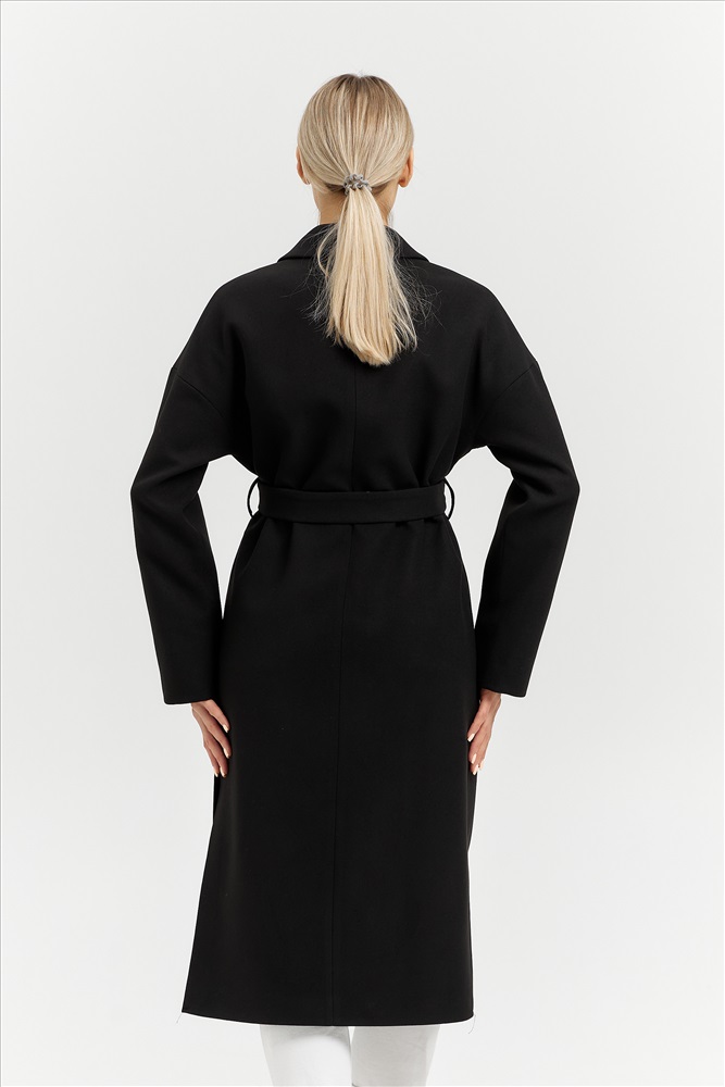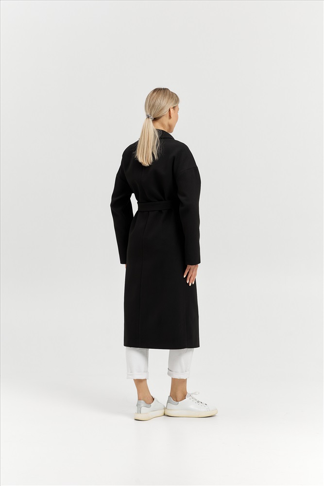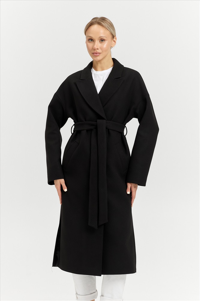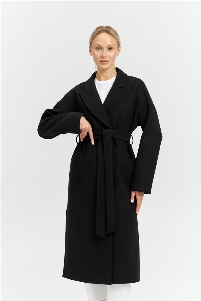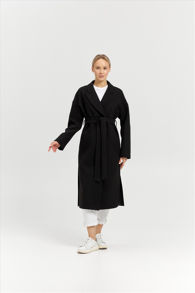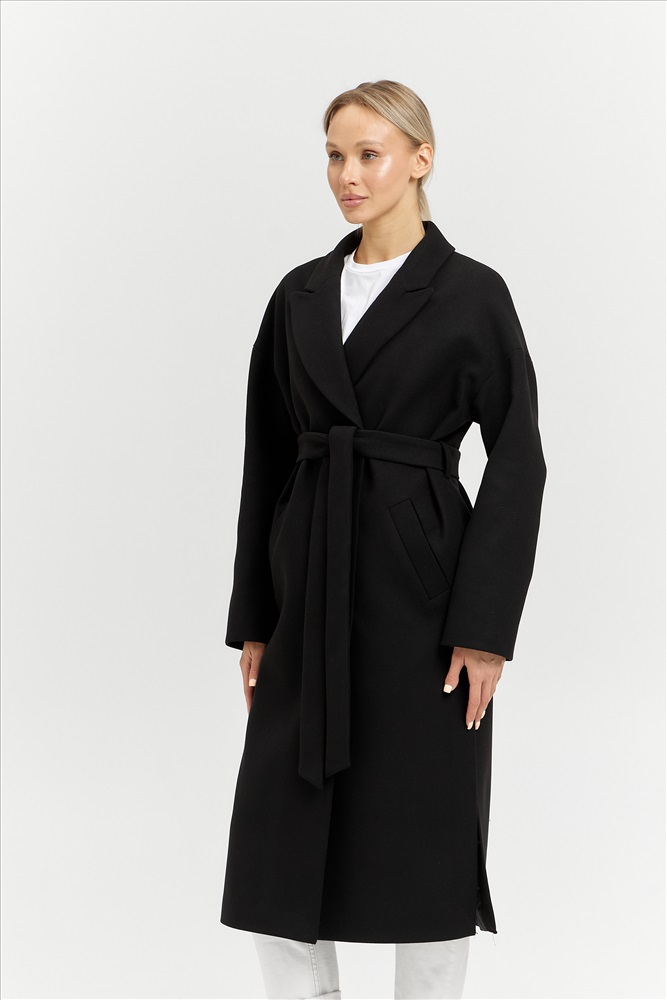 Модель: 26820; Материал: кашемир; Цвет: черный; Состав: 70% шерсть, 30% полиэстер; Параметры модели: 86-62-92, 176; Размер на модели: 42 Описание: Пальто женское демисезонное Силуэт прямой, со спущенной проймой. Воротник отложной с лацканами, лацканы с острыми углами, приподнятыми вверх. В боковых швах разрезы и шлевки под пояс. Длина рукава от втачивания воротника 72,5 см. Длина изделия по спинке 120 см.