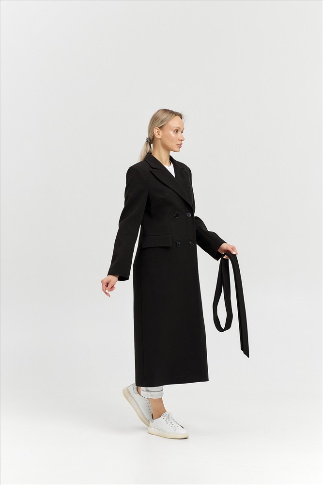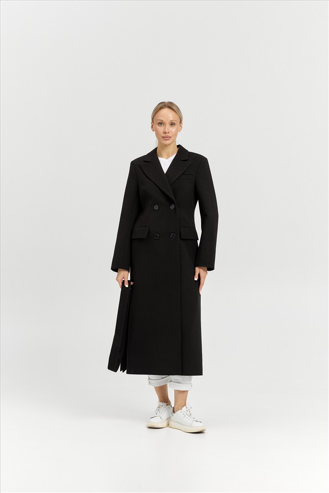 Модель: 26895; Материал: рубчик; Цвет: черный/рубчик; Состав: 70% шерсть, 30% полиэстер; Размер на модели: 44 Описание: Пальто приталенного силуэта с втачным рукавом. Воротник английский. Рукав -втачной 2х-шовный со шлицей на 4 петли и пуговицы. . Застёжка -двубортная, ассиметричная с 4 пуговицами и 1 потайной. Спинка - со средним швом и шлицей. Рельефы идут из проймы и переходят в талиевую вытачку. Карманы - налевой полочке нагрудный карман-обманка с втачной листочкой. Основные карманы прорезные с листочкой и клапаном. Длина рукава с плечом - 76 см+-/1см Длина изделия по спинке - 125 см+-/2см