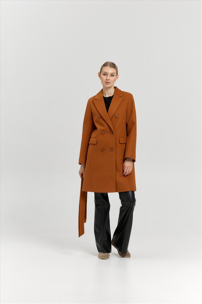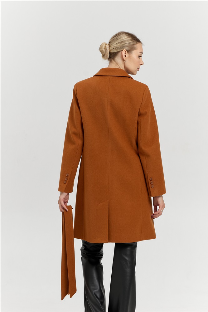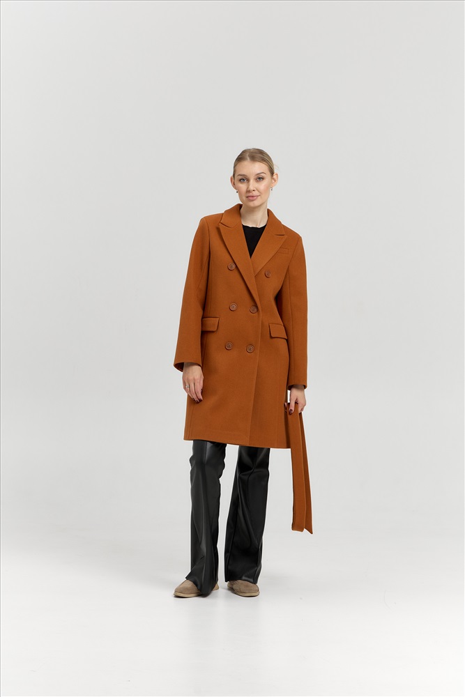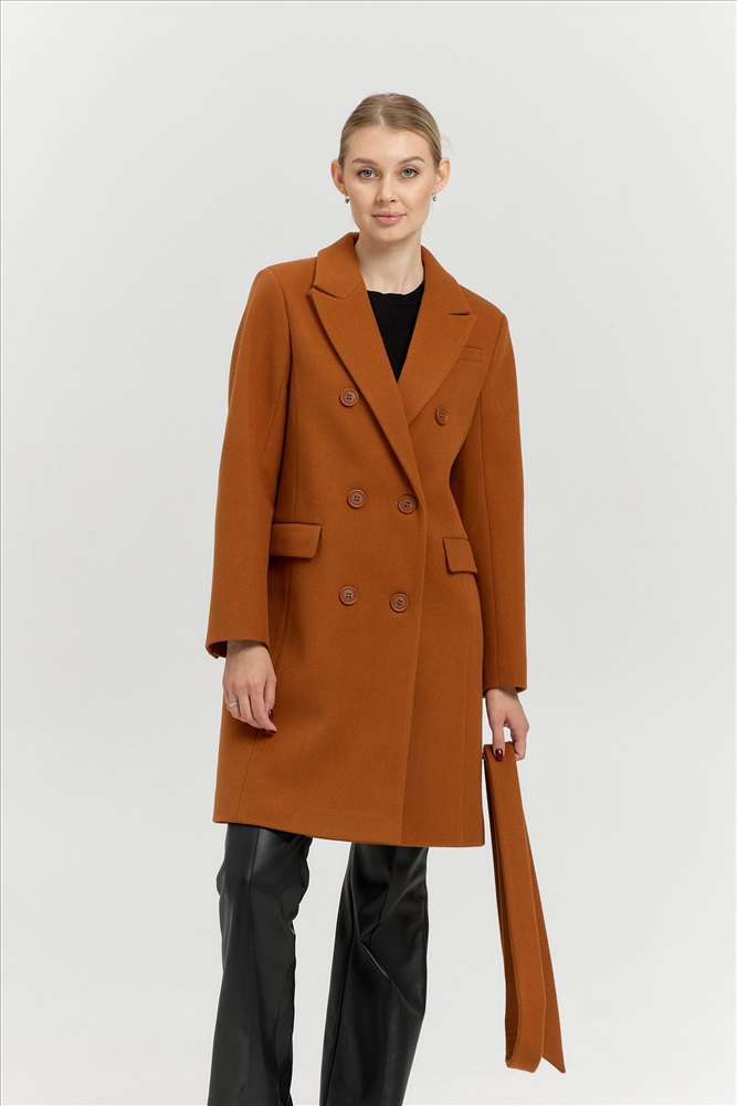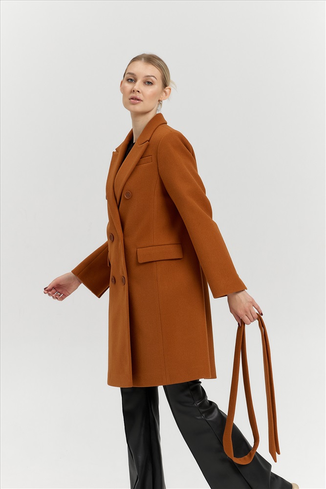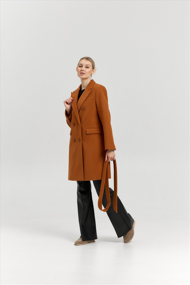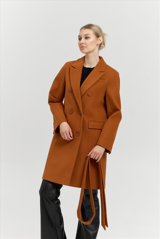 Модель: 26897; Материал: кашемир; Цвет: карамель; Состав: 70% шерсть, 30% полиэстер; Размер на модели: 44 Описание: Силуэт - полуприталенный с втачным рукавом. Воротник английский. Рукав -втачной 2х-шовный со шлицей на 3 пуговицы. . Застёжка -двубортная, ассиметричная с 6 пуговицами и 1 потайной. Спинка - со средним швом и шлицей. Карманы - прорезные с листочкой и клапаном. Длина рукава с плечом - 73,5 см+-/1см Длина изделия по спинке - 100 см+-/2см