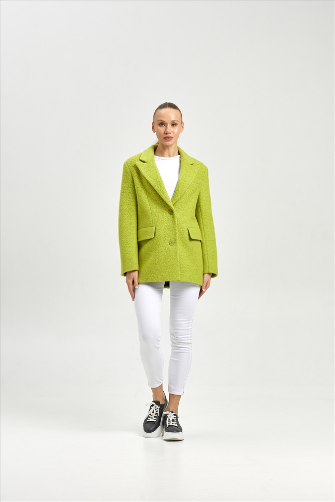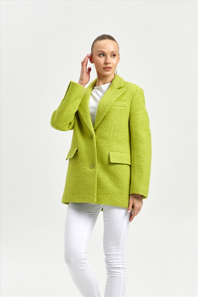 Модель: 27100; Материал: Вареная шерсть; Цвет: лайм; Состав: 70% шерсть, 30% полиэстер Описание: Силуэт - прямой с втачным рукавом. Воротник английский с отрезной стойкой. Рукав -втачной 2х-шовный со шлицей на 4 пуговицы. . Застёжка -однобортная с 2 пуговицами. Спинка - со средним швом и шлицей. Карманы - прорезные в рамку с клапаном. Длина рукава с плечом - 77 см+-/1см Длина изделия по спинке - 78 см+-/2см