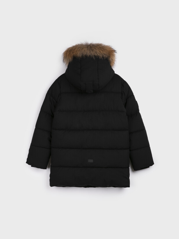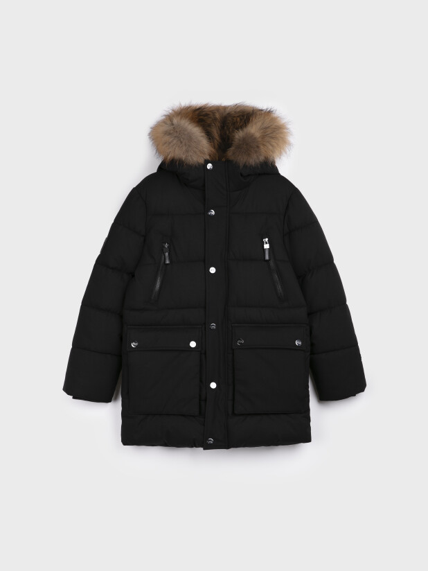 Это зимнее подростковое пальто для школы выполнено из прочного непромокаемого материала — оно защищает от мокрого снега и ветра, при этом не перегревает. Мягкая флисовая подкладка сохраняет тепло, а продуманная посадка позволяет свободно двигаться. Капюшон с утяжками и съёмная опушка из натурального меха дополняют защиту и придают образу аккуратность.