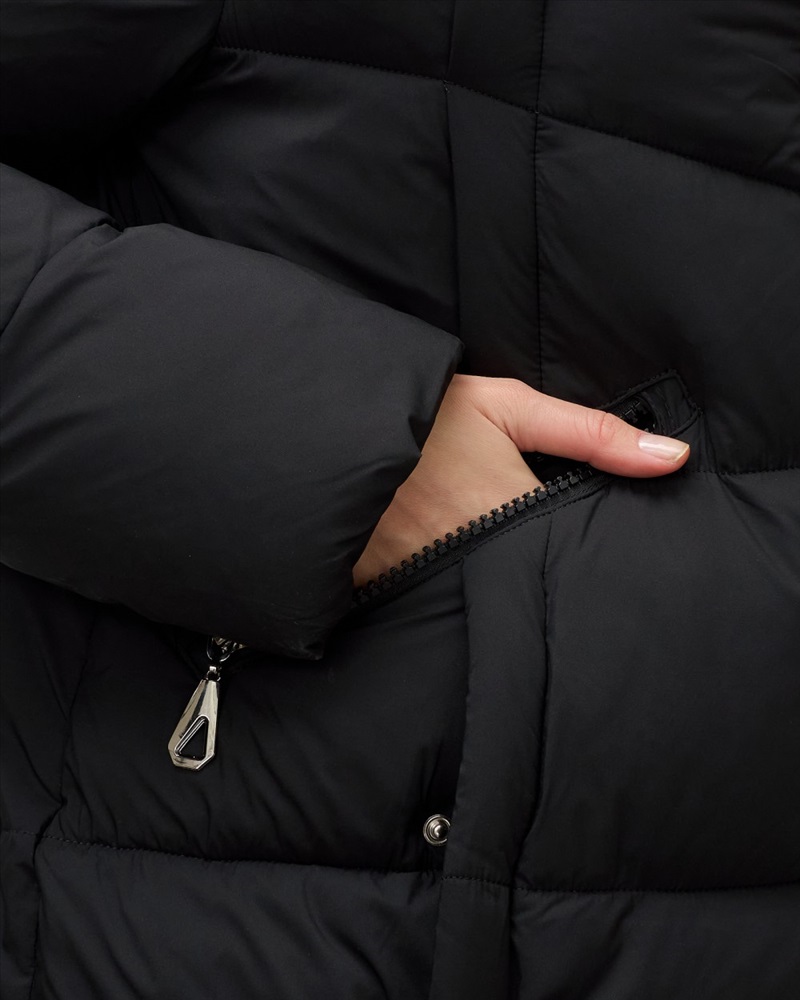 Стильный удлиненный крой ниже колена и свободный покрой делают это пальто универсальным для любого образа — от офисного до повседневного. Не съемный капюшон с фиксатором и стойка воротника защищают от ветра, а внутренние карманы с застежками обеспечивают удобство в использовании.