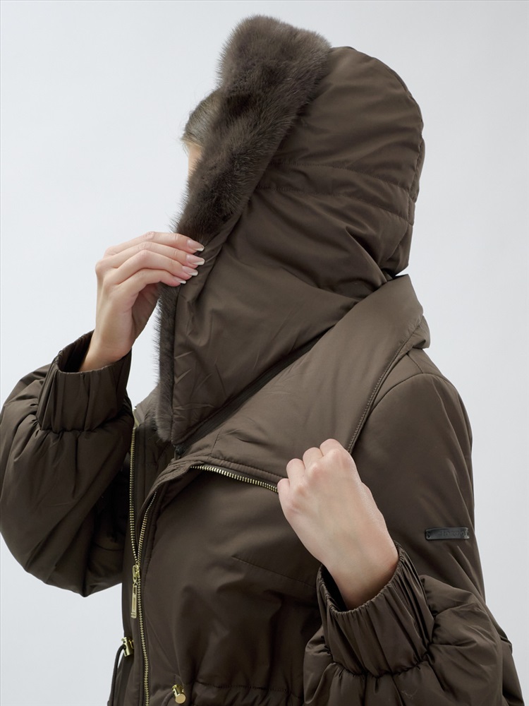 - Съемный капюшон на молнии: Практичное решение для изменения образа и защиты от непогоды. Капюшон украшен несъемным натуральным мехом норки, добавляя нотку роскоши.