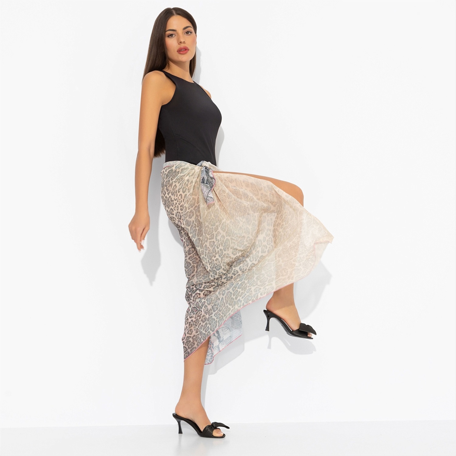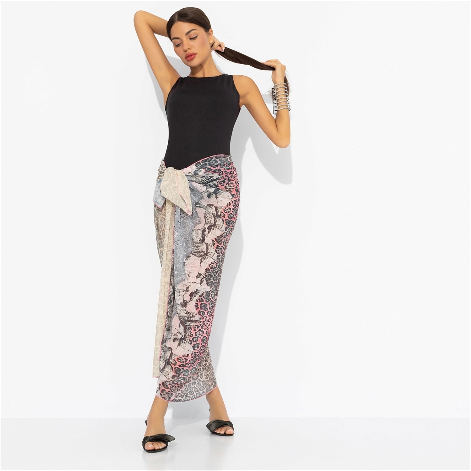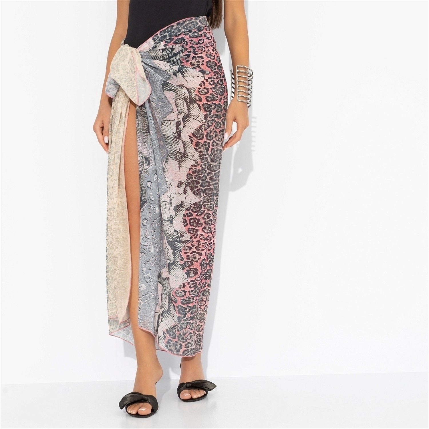 День, когда из одежды вам нужно только парео, официально можно называть счастливым. Стилизуйте как юбку, как платье или просто слегка накиньте на плечи – великолепный образ при любом раскладе. Парео из искусственного шифона. Невесомый материал. Края изделия обработаны. Принт – леопард и цветы.