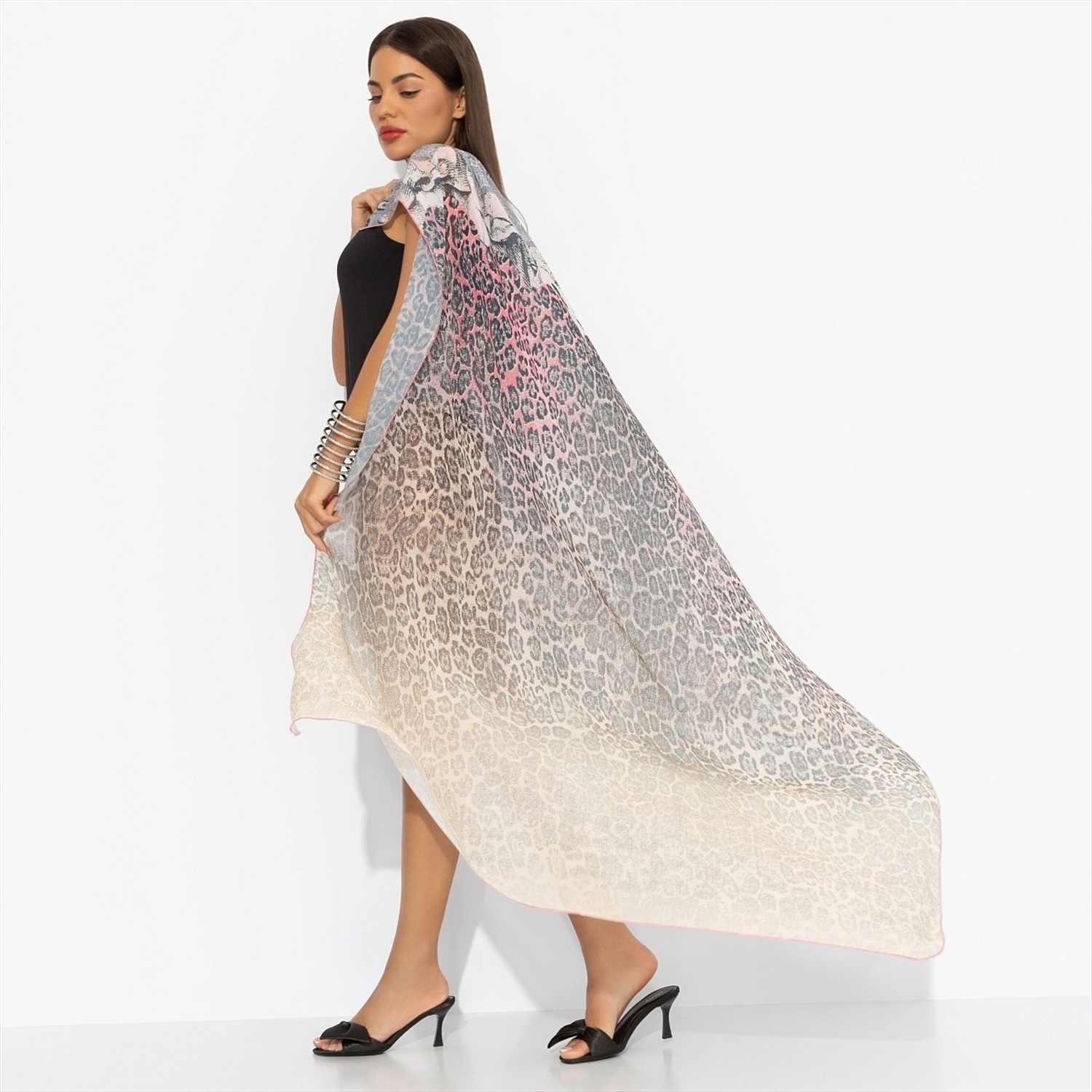 ТН ВЭД: 6211490009; Состав: Шифон (100% п/э); Плотность ткани: Тонкая; Тип ткани: Текстиль; Дополнительный цвет ткани: Розовый; Основной цвет ткани: Серый; Рисунок/раппорт: Каждое изделие уникально из-за расположения рисунка на ткани; Сезон: Лето