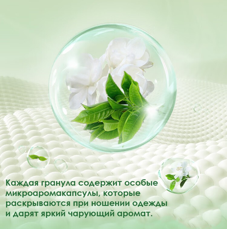 Концентрированный гранулированный ополаскиватель для стирки с неповторимым ароматом придает одежде мягкость и нежность. Каждая гранула содержит особые микроаромакапсулы, которые раскрываются во время соприкосновения волокон ткани при использовании белья или ношении одежды и дарят яркий чарующий аромат. Состав аромата: Верхние ноты - Зеленый Чай; Ноты сердца - Жасмин; Базовые ноты - Пудра. Способ применения: Аромагранулы насыпаются непосредственно в барабан стиральной машиной перед началом стирки. Вы можете увеличить или уменьшить количество в зависимости от ваших личных предпочтений в отношении интенсивности аромата и веса белья. Меры предосторожности: хранить в недоступном для детей месте. Применять в соответствии с назначением. Комментарии к товару