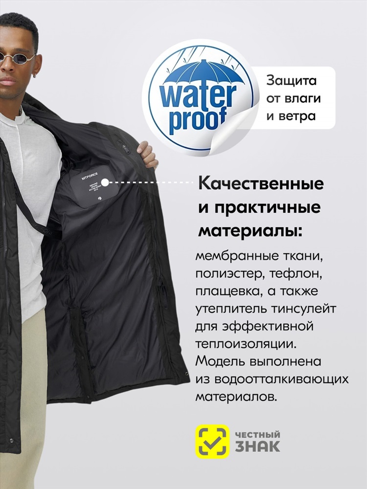 Производитель: MTFORCE; Артикул: 2416_1Ch; Бренд: MTFORCE; Пол: Мужской; Сезон: Зима; Страна производителя: Китай; Тип: Парка; Цвет: Черный; Рост: от 165 до 200; Диапазон температур: от 0° до - 25°; Водонепроницаемость: 7000 мм; Комплектация: Куртка/Капюшон/Ремень-фиксатор; Состав: 100% Полиэстер; Материал: Мембранные материалы, Полиэстер, Тефлон, Плащевка; Материал подкладки: 100% Полиэстер; Материал подкладки воротника: 100% Полиэстер; Материал наполнителя: Тинсулейт; Фактура материала: гладкая; Утеплитель гр: от 460 до 540; Плотность утеплителя (г/кв.м): 260; Покрой: Прямой/Свободный; Длина подола: Удлиненная; Длина одежды: ниже колена; Тип рукава: Длинная на манжете; Внутренние карманы: Есть (молния); Тип кармана: Накладной на магните; Воротник: Капюшон; Фиксаторы: На капюшоне; Опции капюшона: не съемный; Декоративные элементы: Карманы, Манжеты, Пояс/ремень, Лейбл; Внутренние швы: Проклеены/Прошиты; Вид застежки: Двойная молния/Магниты/Клапан; Особенности модели: водоотталкивающий материал, гипоаллергенный материал, потайной карман, с начесом, с разрезом, ветрозащита; Вид одежды: Свободная, утепленная модель; Стиль: Спортивный, Офисный/школьный, Повседневный; Рисунок: Однотонный/Надписи/Логотип; Коллекция: Осень-Зима 2024; Тип упаковки: Пакет; Цвета: черный, темно-синий, хаки; Габариты (ДхШхВ): 50 x 46 x 21 см; Вес: 1.7 кг; Уценка: Кнопки иногда слетают!Внимание!!! Товар из раздела "Уценка" не подлежит возврату и обмену. Товары из раздела "Уценка" не возвращаются и не обмениваются.