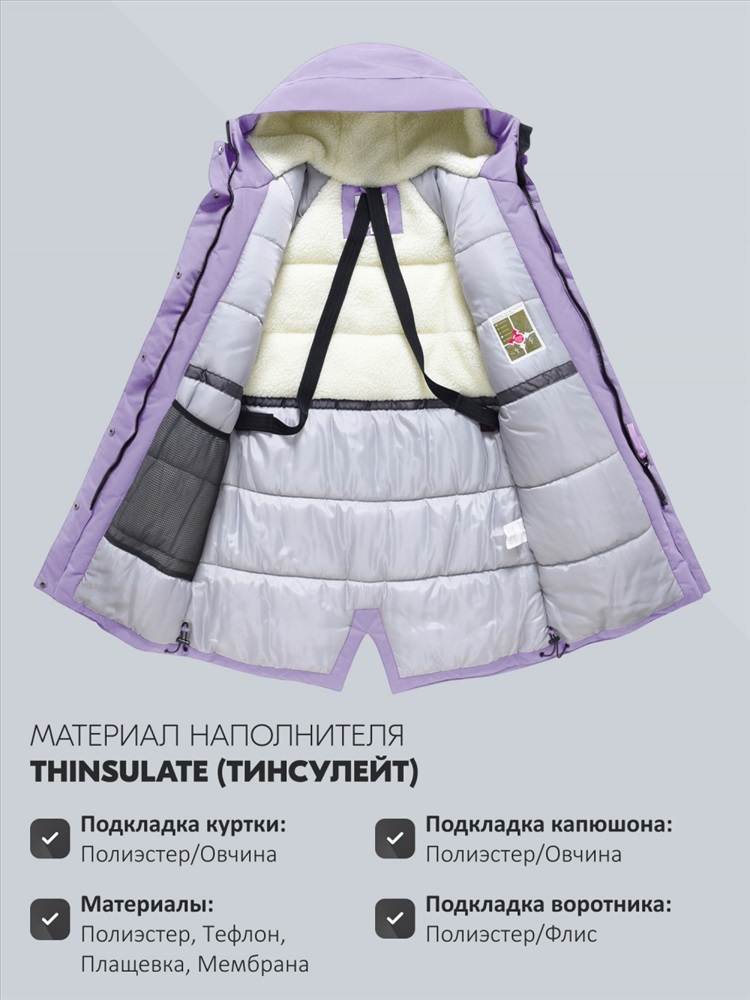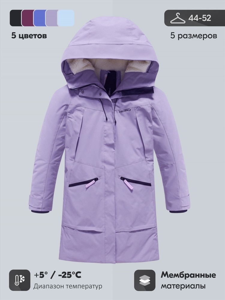 Производитель: VALIANLY; Артикул: 9538-1Sn; Бренд: VALIANLY; Пол: Женский; Сезон: Зима; Страна производителя: Китай; Тип: Парка; Цвет: Сиреневый; Диапазон температур: °С от + 5° до - 25°; Водонепроницаемость: До 10 000 мм; Состав: 100% Полиэстер; Материал: Мембранные материалы, Полиэстер, Тефлон, Плащевка; Материал подкладки куртки: Полиэстер/Овчина; Материал подкладки капюшона: Полиэстер/Овчина; Материал подкладки воротника: Полиэстер/Флис; Материал наполнителя: Тинсулейт (Thinsulate); Фактура материала: плотная; Паропроницаемость: До 5 000 г/м²/24 ч; Плотность утеплителя (г/кв.м): 295; Покрой: свободный; Длина одежды: до колена; Тип рукава: Длинная на манжете; Внутренние карманы: Есть; Тип кармана: Прорезной на молнии (с начесом); Форма воротника: стояче-отложной; Фиксаторы: На рукавах, по середине, на капюшоне, по низу; Опции капюшона: Не съемный; Декоративные элементы: Манжеты, Пояс/ремень, Кнопки, Капюшон; Внутренние швы: Проклеены; Вид застежки: Двойная молния/Кнопки/Клапан; Особенности модели: водоотталкивающий материал, гипоаллергенный материал, с разрезом, с начесом, светоотражающие детали, утягивающая модель; Вид одежды: Свободная, Утепленная модель; Стиль: Повседневный, Школьный, Спортивный; Рисунок: Надписи, Логотип, Однотонный, Светится в темноте; Коллекция: Осень-зима 2026; Тип упаковки: Пакет; Цвета: бордовый, черный, сиреневый, васильковый, бирюзовый; Габариты (ДхШхВ): 52 x 45 x 11 см; Вес: 1.61 кг
