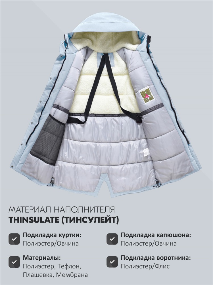 Производитель: VALIANLY; Артикул: 9538-1Si; Бренд: VALIANLY; Пол: Женский; Сезон: Зима; Страна производителя: Китай; Тип: Парка; Цвет: Светло-синий; Диапазон температур: °С от + 5° до - 25°; Водонепроницаемость: До 10 000 мм; Состав: 100% Полиэстер; Материал: Мембранные материалы, Полиэстер, Тефлон, Плащевка; Материал подкладки куртки: Полиэстер/Овчина; Материал подкладки капюшона: Полиэстер/Овчина; Материал подкладки воротника: Полиэстер/Флис; Материал наполнителя: Тинсулейт (Thinsulate); Фактура материала: плотная; Паропроницаемость: До 5 000 г/м²/24 ч; Плотность утеплителя (г/кв.м): 295; Покрой: свободный; Длина одежды: до колена; Тип рукава: Длинная на манжете; Внутренние карманы: Есть; Тип кармана: Прорезной на молнии (с начесом); Форма воротника: стояче-отложной; Фиксаторы: На рукавах, по середине, на капюшоне, по низу; Опции капюшона: Не съемный; Декоративные элементы: Манжеты, Пояс/ремень, Кнопки, Капюшон; Внутренние швы: Проклеены; Вид застежки: Двойная молния/Кнопки/Клапан; Особенности модели: водоотталкивающий материал, гипоаллергенный материал, с разрезом, с начесом, светоотражающие детали, утягивающая модель; Вид одежды: Свободная, Утепленная модель; Стиль: Повседневный, Школьный, Спортивный; Рисунок: Надписи, Логотип, Однотонный, Светится в темноте; Коллекция: Осень-зима 2026; Тип упаковки: Пакет; Цвета: бордовый, черный, сиреневый, васильковый, бирюзовый; Габариты (ДхШхВ): 52 x 45 x 11 см; Вес: 1.61 кг
