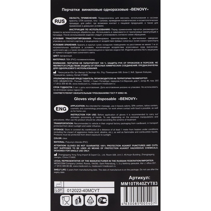 Габариты: 6,5 x 11 x 21; Страна: Китай; В боксе: 500 пара; Состав: Винил; Материалы: винил; Фасовка: по 50 пара; Индивидуальная упаковка: Цветная картонная коробка; Сертификат: Не подлежит сертификации; Цвет: Прозрачный; В упаковке, шт.: 100; Материал: Винил; Размер: M; Тип перчаток: Виниловые; Тип: Нестерильные; Тип покрытия перчаток: Полиуретановое покрытие; Особенности: Универсальные; Химически стойкие: Да; Назначение перчаток: Медицинские, Для уборки