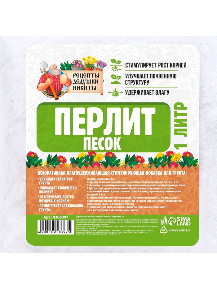 Производитель: Рецепты дедушки Никиты; Габариты: 17 x 14 x 3; Доставка: Платная; Страна: Россия; В боксе: 100 шт; Состав: См. на упаковке; Материалы: см. на упаковке; Фасовка: по 1 шт; Индивидуальная упаковка: Пакет; Сертификат: Не подлежит сертификации; Область применения: Для всех видов растений и культур; Вес/Объём: 1 л