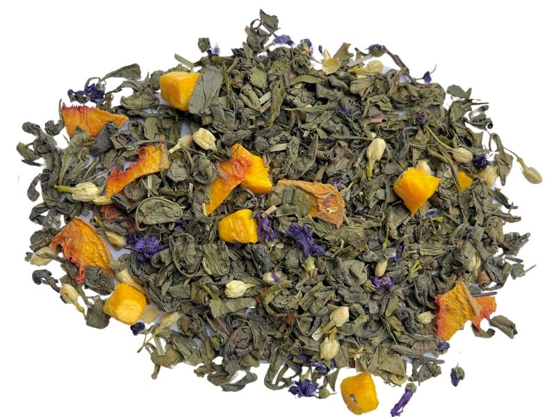Экзотический бленд крупнолистового зеленого китайского чая, кусочков маракуйи и персика, лемонграсса, мяты, цветов мальвы и жасмина. С цветочно-фруктовым ароматом.