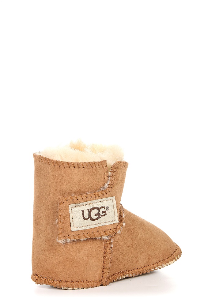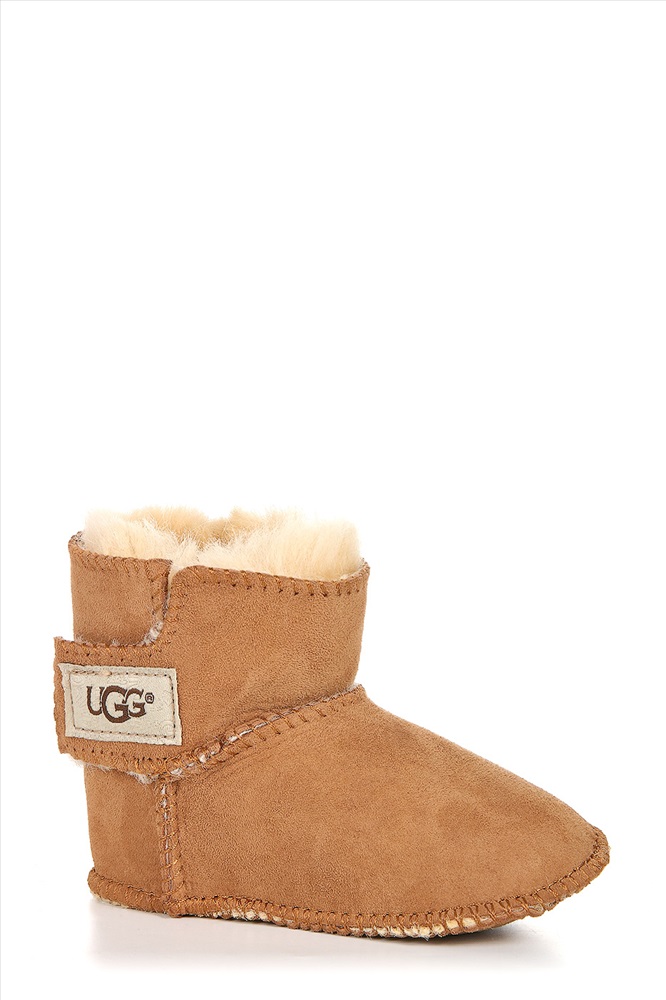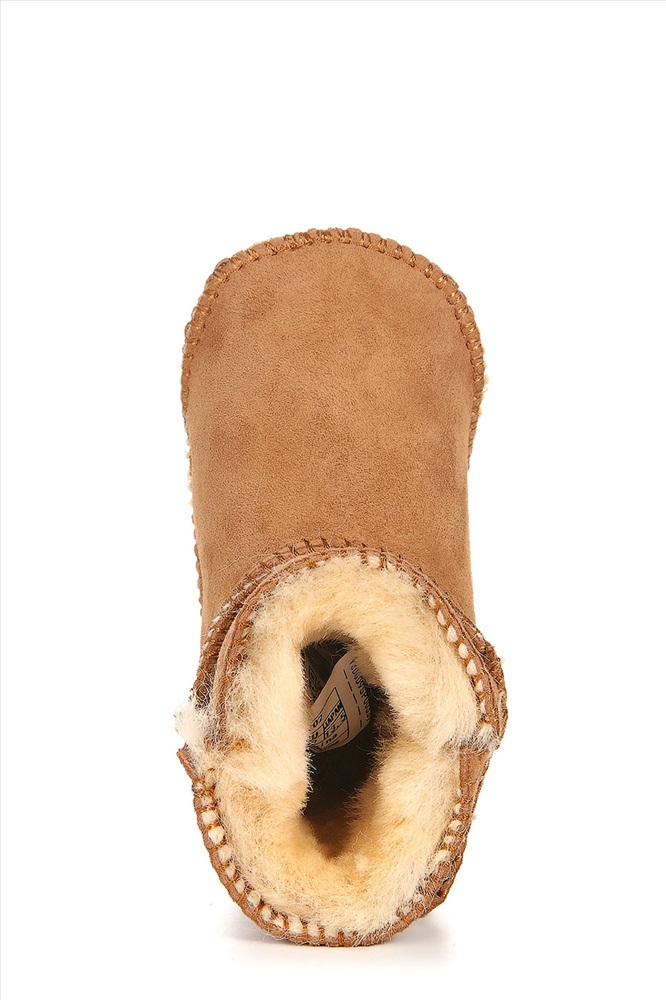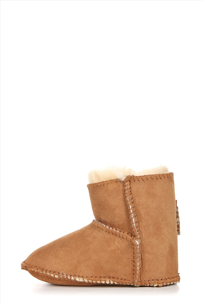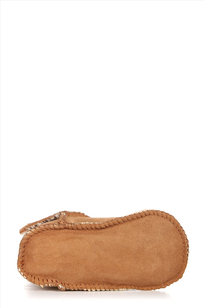 Пинетки выполнены из натуральной замши, верх оформлен объемными швами. Внутренняя отделка из натуральной шерсти. Детали: застежка на липучку.