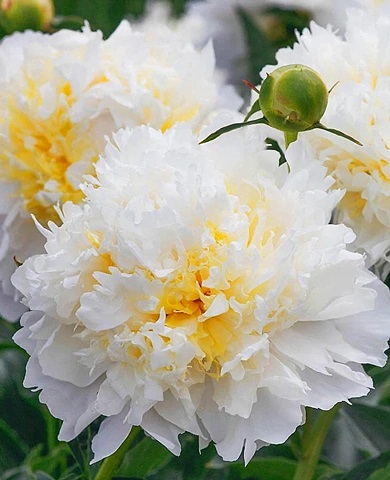 Крупные помпоновидные цветки кремово-белого цвета появляются уже в начале лета. В центре – желтые лепестки, преобразованные из тычинок, создают эффект внутреннего свечения. Диаметр цветка 16–18 см. Цветение пышное, по 2–3 бутона на каждом стебле. Сорт отличается высокой зимостойкостью – не боится даже 40-градусных морозов и не требует укрытия.