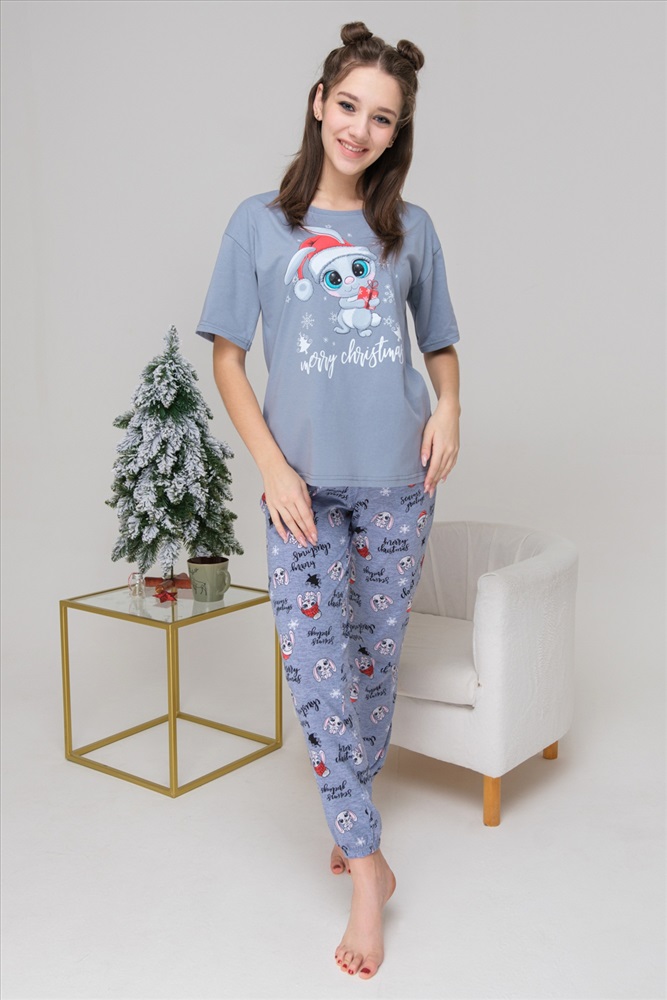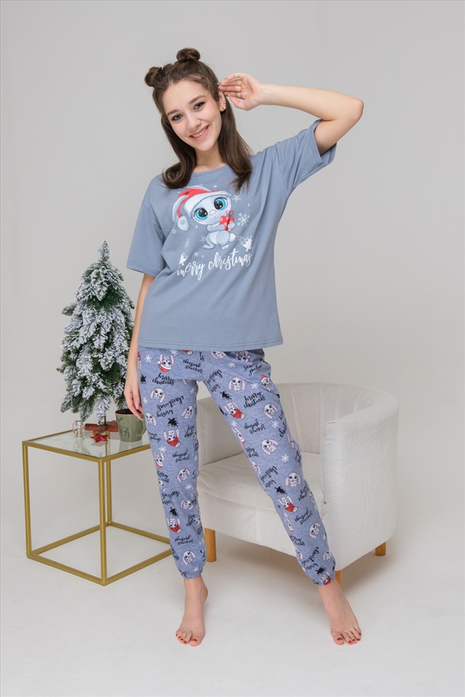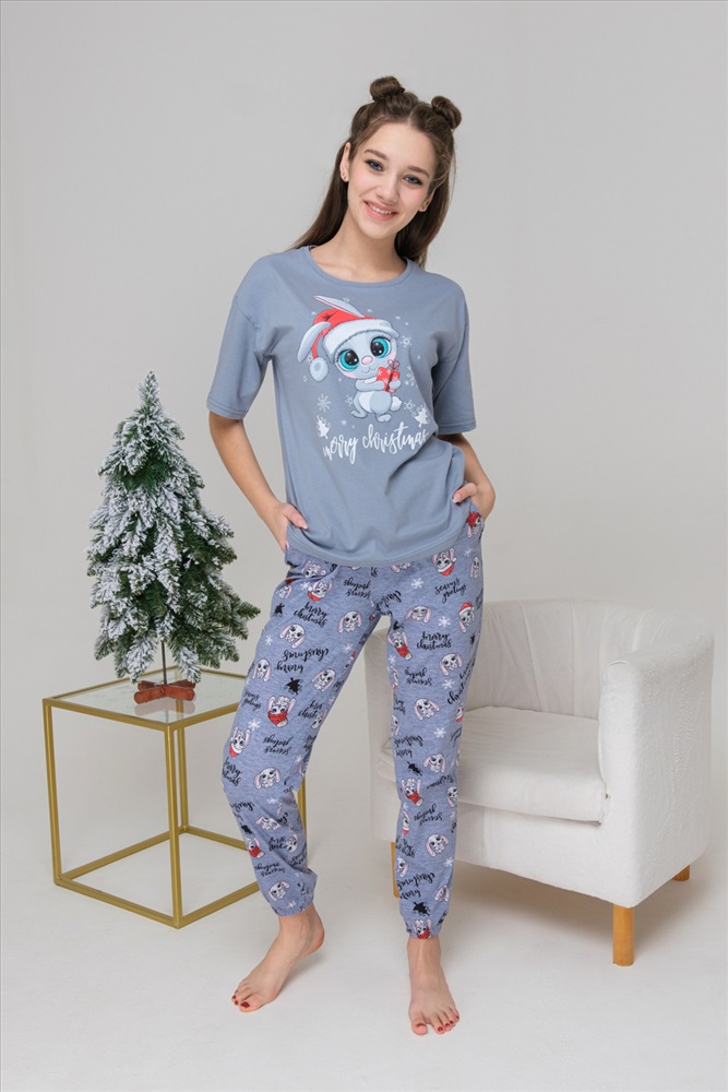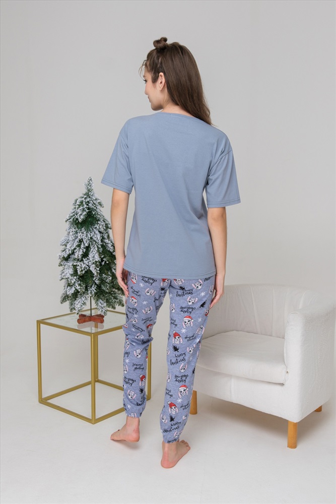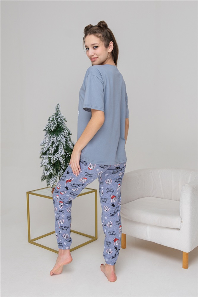 Пижама женская с брюками. Футболка свободного кроя с оригинальной печатью на груди. Брюки с боковыми карманами, внизу на резинке. Хорошо сидит на фигуре, уютно для дома.