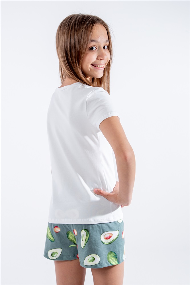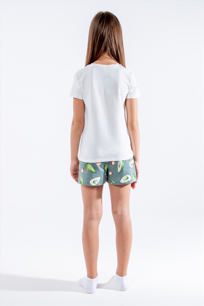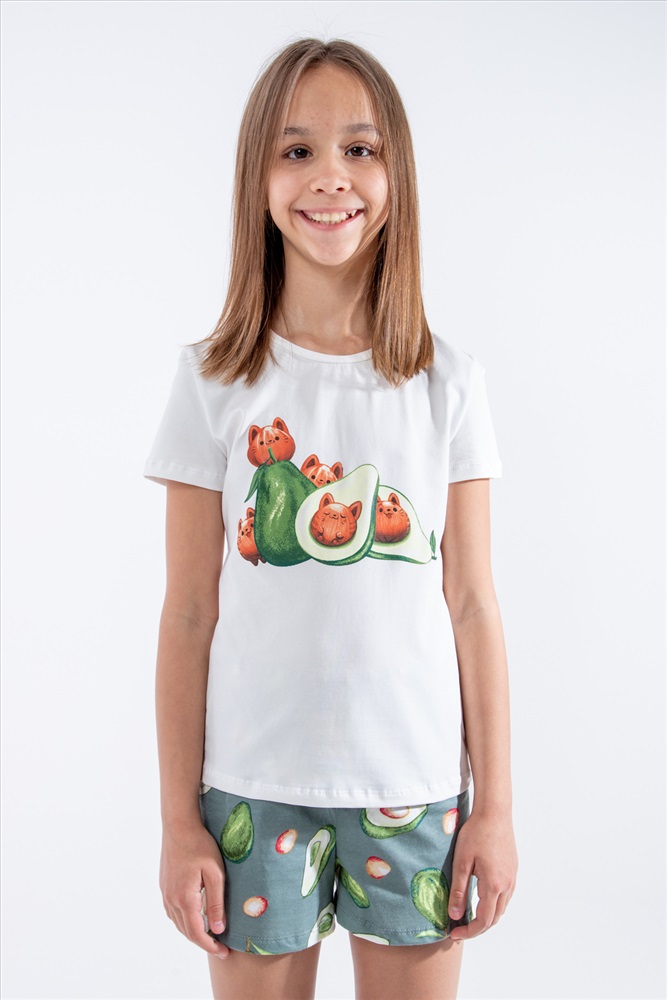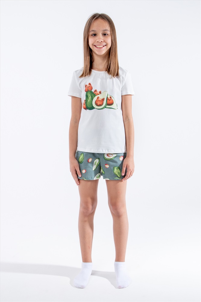 Комфортная пижама для девочки с ярким модным принтом Авокадо. Пижама детская состоит из футболки и шорт. Дизайн ткани позволяет использовать пижаму не только для сна, но и как костюм для дома. Модель пижамы не сковывает движения ребенка во время сна. Покрой футболки полуприлегающий, шорты классические без карманов. Пижама выполнена из 100% гиппоаллергенного хлопка (футболка - 95% хлопок, 5% эластан шорты - 100% хлопок), что позволяет коже ребенка дышать во время сна.