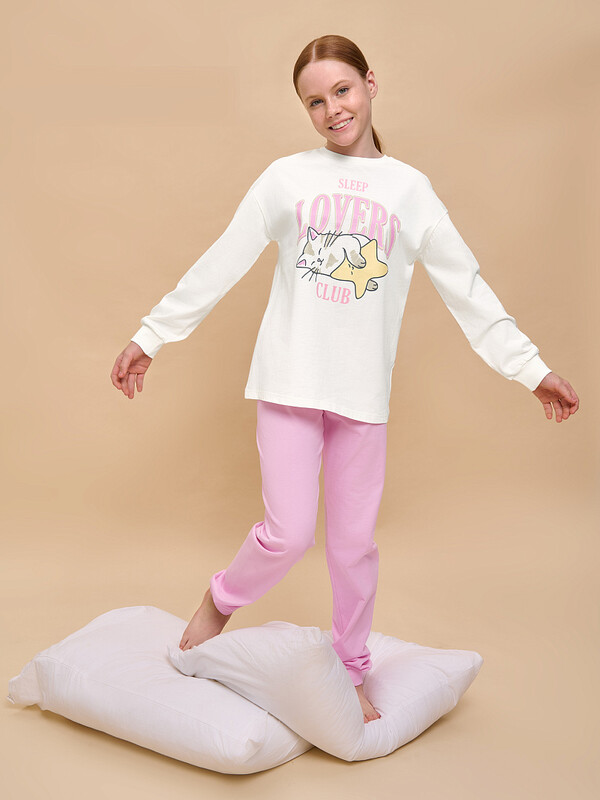 Состав: верх: 100%хлопок, низ: 100%хлопок Детская пижама для девочки. Модель выполнена из 100% хлопка — идеальный вариант для детской пижамы. Комплект для сна мягкий, гипоаллергенный и хорошо пропускает воздух. В хлопковой пижаме ребёнку будет тепло, даже если он раскроется во время сна. Всё это способствует комфортному и качественному сну. Джемпер и брюки умеренного объёма, плечо немного спущено, рукава широкие и свободные — в пижаме очень удобно спать. В поясе брюк мягкая и широкая резинка — не перекручивается и не давит. Манжеты и отделка горловины из эластичной рибаны — они не растягиваются, пижаму удобно надевать и снимать. Хлопковая пижама украшена милым принтом в виде спящего котика, надпись переводится: «клуб любителей поспать» — понравится любой девочке. Детская пижама неприхотлива в уходе. Принт эластичный и мягкий, легко переносит частые стирки. Детская пижама с брюками подходит для сна как дома, так и в детском саду — отличный выбор для вашего ребёнка! Помните о правильном уходе за изделием: рекомендуется стирать при температуре не выше 30 °C, без предварительного замачивания, с изнанки. Это поможет сохранить качество и цвет пижамы на длительное время. Не забывайте о выборе правильного размера. Используйте таблицу размеров на фотографии, чтобы выбрать подходящий вариант для вашей девочки. Обратите внимание, что цвет товара на экране вашего устройства может отличаться от реального. Комментарии к товару