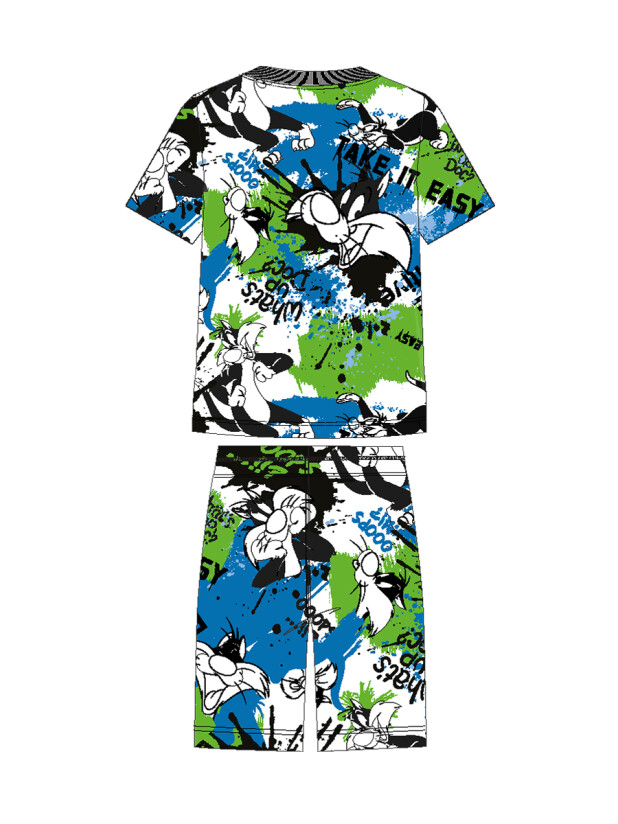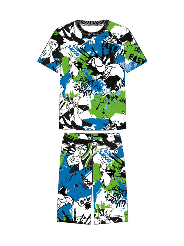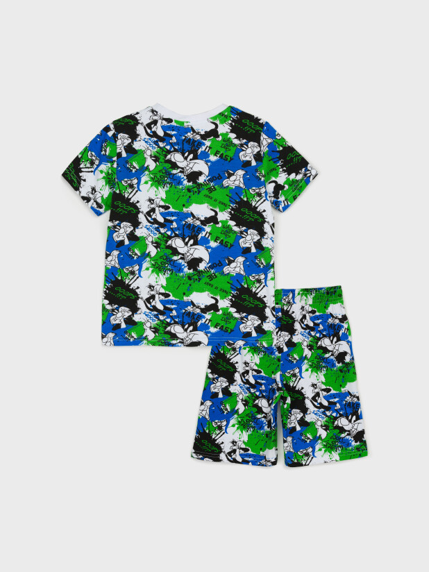 Пижама детская для мальчика. Футболка и шорты из эластичного и приятного на ощупь трикотажа. Шорты на резинке со шнурком. Шорты с карманами в боковых швах. Высокое содержание хлопка 95%. Благодаря наличию эластана в составе ткани изделие держит форму и меньше мнется.
