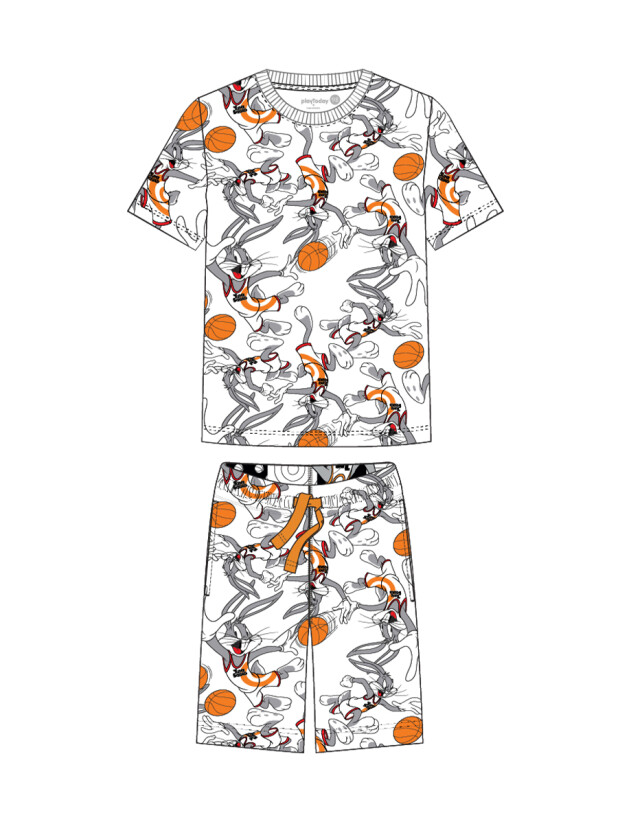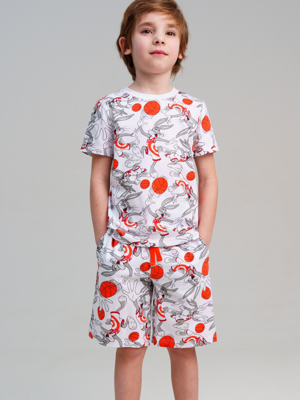 Пижама детская для мальчика. Футболка и шорты из эластичного и приятного на ощупь трикотажа. Шорты на резинке со шнурком. Высокое содержание хлопка 95%. Благодаря наличию эластана в составе ткани изделие держит форму и меньше мнется.