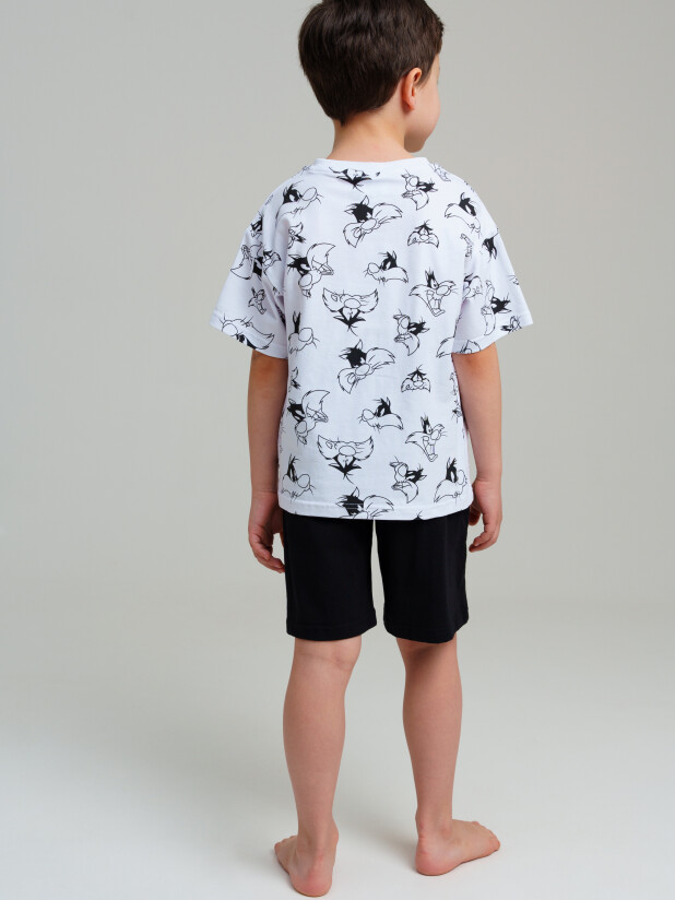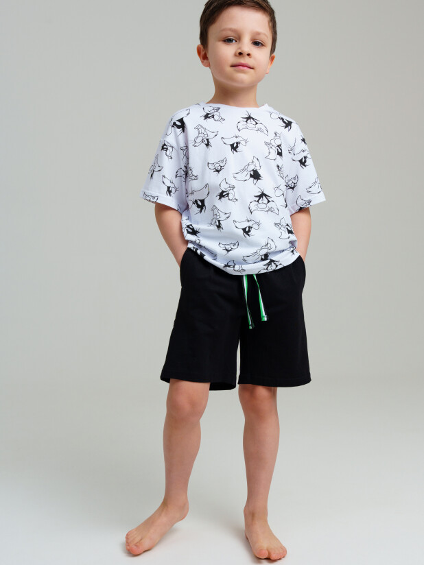 Пижама детская для мальчика. Футболка и шорты из эластичного и приятного на ощупь трикотажа. Шорты на резинке со шнурком. Шорты с карманами в боковых швах. Высокое содержание хлопка 95%. Благодаря наличию эластана в составе ткани изделие держит форму и меньше мнется.