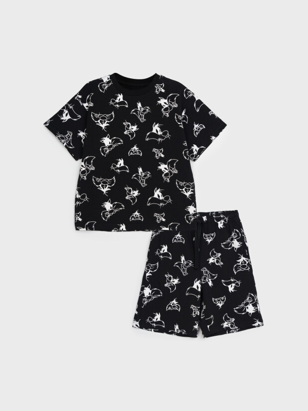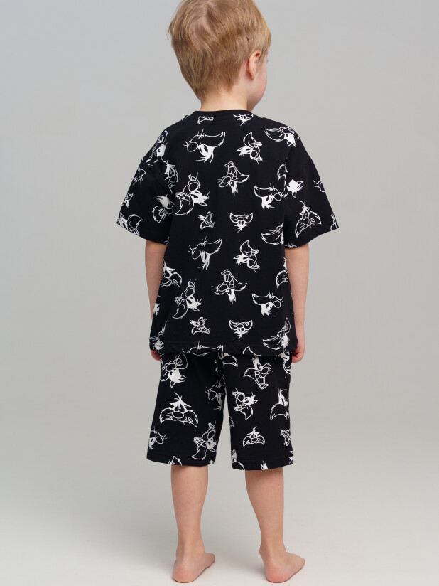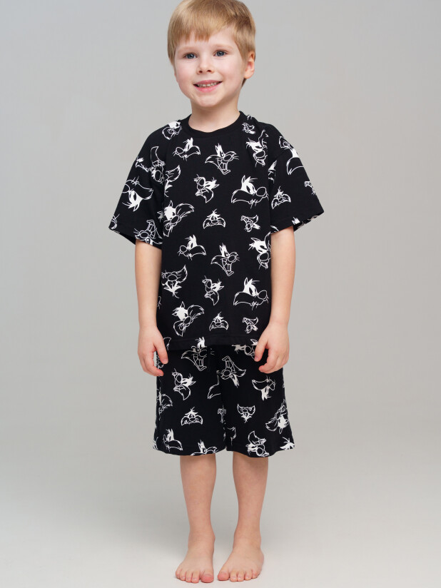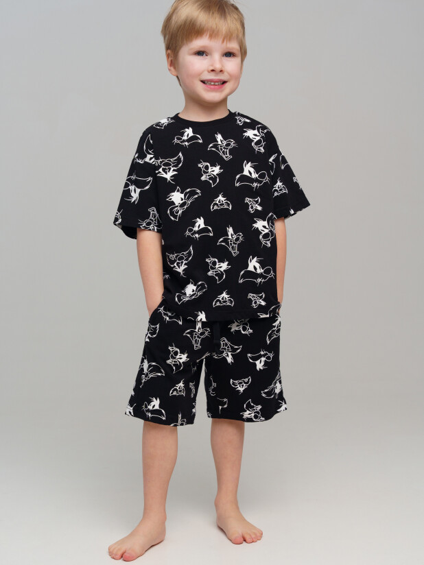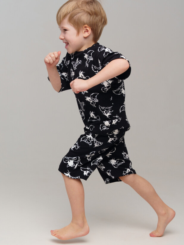 Пижама детская для мальчика. Футболка и шорты из эластичного и приятного на ощупь трикотажа. Шорты на резинке со шнурком. Шорты с карманами в боковых швах. Высокое содержание хлопка 95%. Благодаря наличию эластана в составе ткани изделие держит форму и меньше мнется.