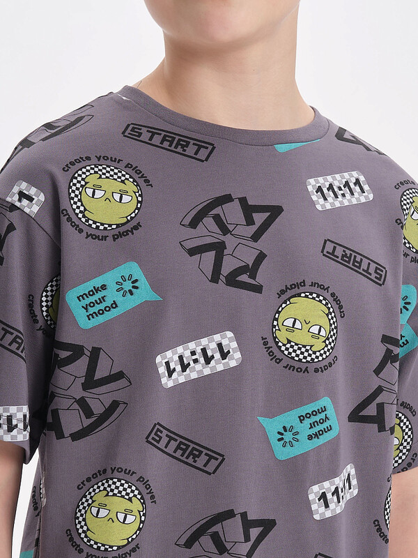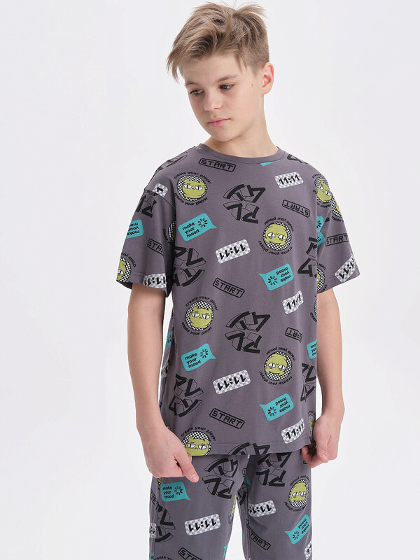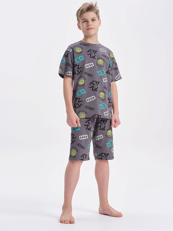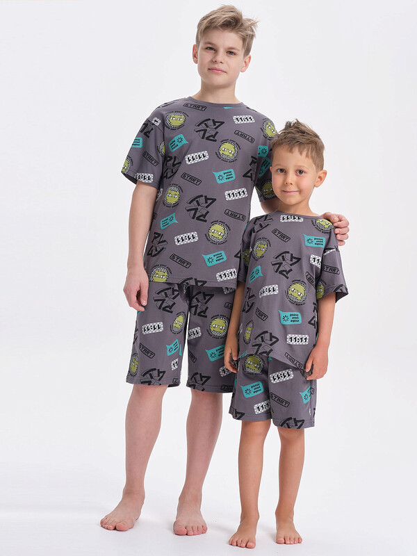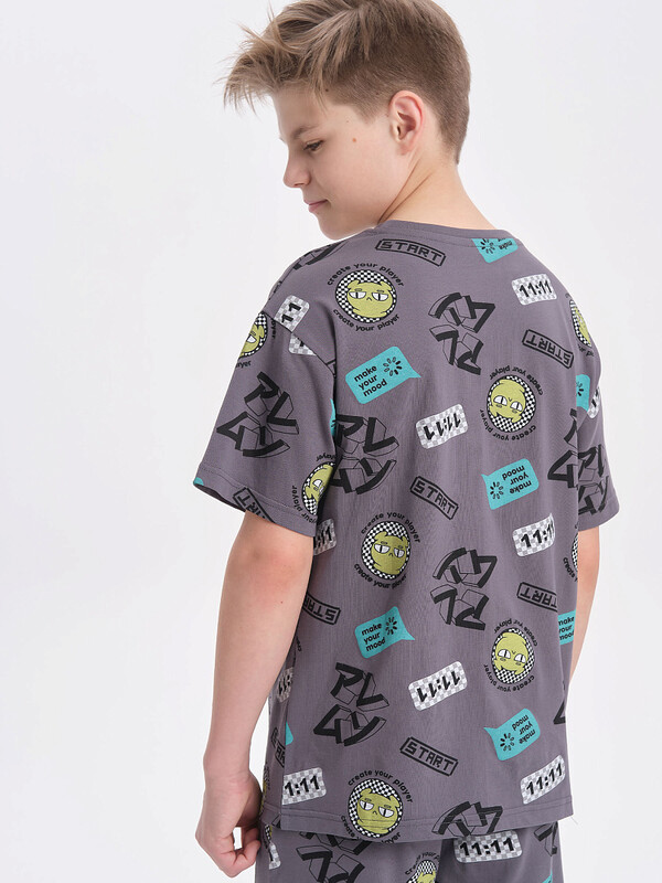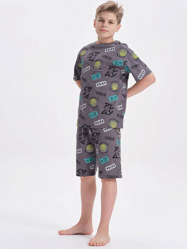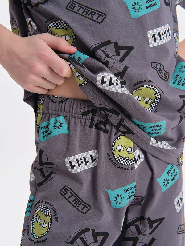 Стильная и уютная пижама для мальчика. В составе ткани 100% хлопка — идеально для детской одежды! Модель приятна на ощупь, прекрасно пропускает воздух, позволяя коже ребёнка дышать. При этом в пижаме из хлопка ребёнку будет уютно, даже если он сбросит одеяло. Всё это обеспечивает комфортный и качественный сон. Футболка и  удлиненные шорты, плечо спущено, рукава широкие и свободные — пижама на мальчика очень удобна для сна. Широкая и мягкая резинка в поясе не перекручивается и не давит. Отделка горловины из эластичной рибаны — она не растягивается, ребёнку удобно надевать и снимать пижаму. Перевод надписей: "создай себе настроение", "создай своего игрока", "творец", "игра". Хлопковый комплект идеален для сна и отдыха дома — прекрасный выбор для вашего ребёнка! Пижама с шортами для мальчика подходит для круглогодичного использования. Домашний комплект — замечательный подарок сыну, внуку, брату на любой праздник. Выбирайте нужный размер по таблице размеров на фото. Цвет товара на экране вашего устройства может отличаться от цвета изделия вживую.