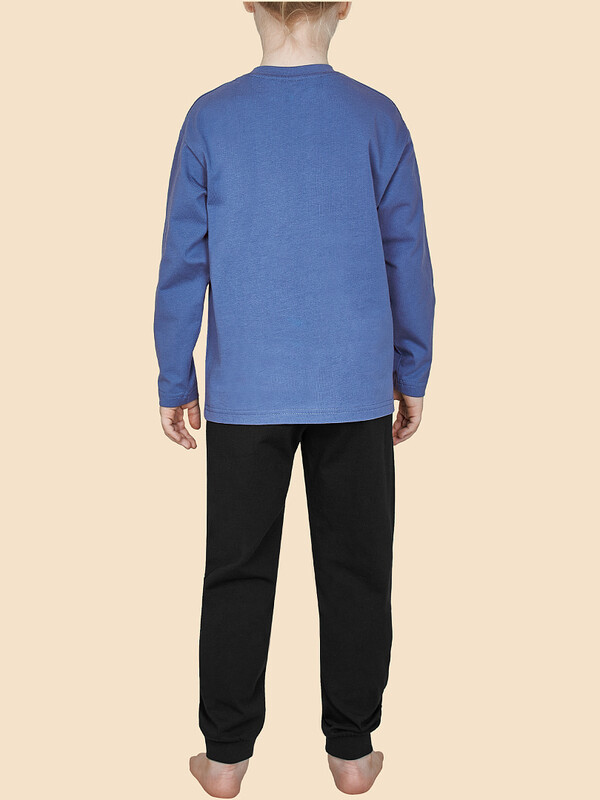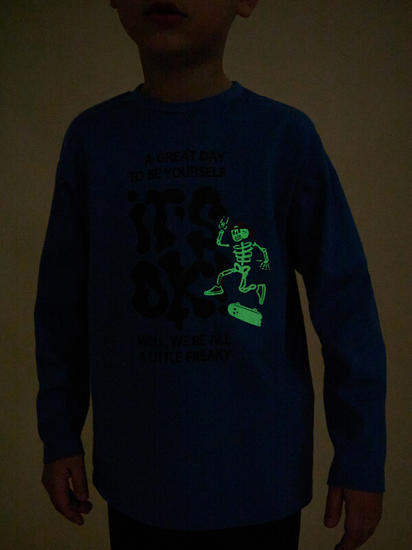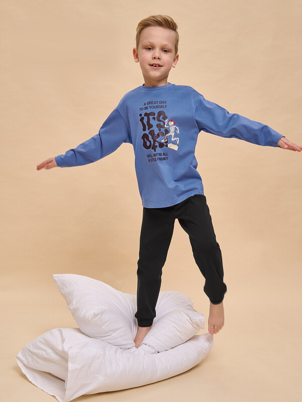 Пижама детская для мальчика. Натуральный состав ткани (100% хлопка) обеспечивает изделию мягкость, гипоаллергенность и воздухопроницаемость. Благодаря этому сон комфортный и качественный. В пижаме из хлопка ребёнку будет тепло, даже если он сбросит одеяло. Джемпер и брюки умеренного объёма, рукава широкие и свободные — комплект для сна очень удобен. В поясе и по низу брюк мягкая и широкая резинка — не перекручивается и не давит. Отделка горловины джемпера из эластичной рибаны — ребёнку удобно надевать и снимать пижаму. А также рибана сохраняет отличную форму надолго. Хлопковая пижама украшена забавным принтом в готическом стиле, надписи переводятся: «хороший день, чтобы быть собой», «всё окей!», «все мы немного странные». Фишка модели — принт светится в темноте! Такая особенность непременно понравится любому ребёнку. Детская пижама для мальчика неприхотлива в уходе. Принт эластичный и мягкий, без проблем переносит частые стирки. Детская пижама с брюками подходит для сна как дома, так и в детском саду — отличный выбор для вашего ребёнка! Помните о правильном уходе за изделием: рекомендуется стирать при температуре не выше 30 °C, без предварительного замачивания, с изнанки. Это поможет сохранить качество и цвет пижамы на длительное время.