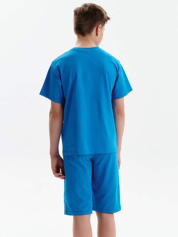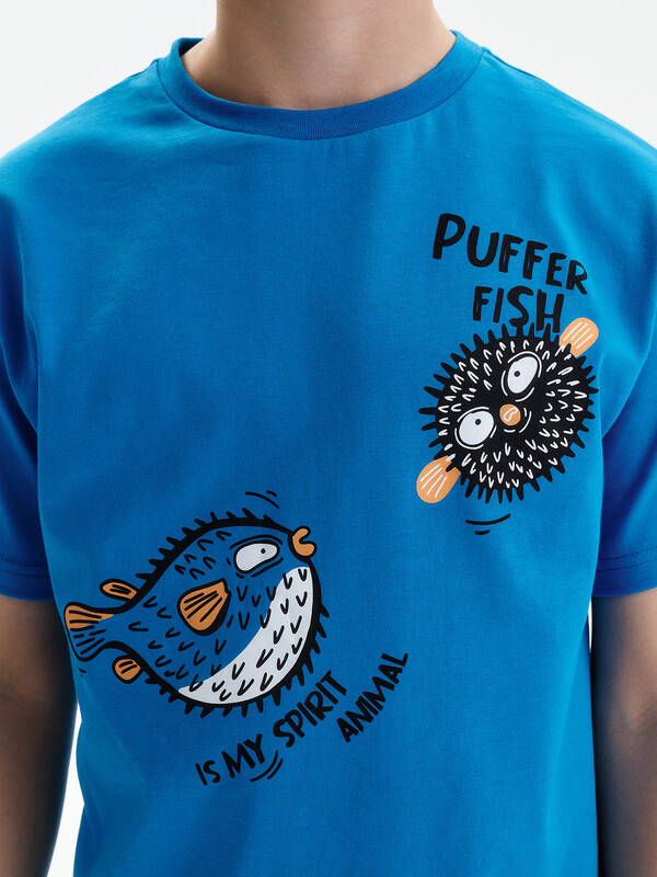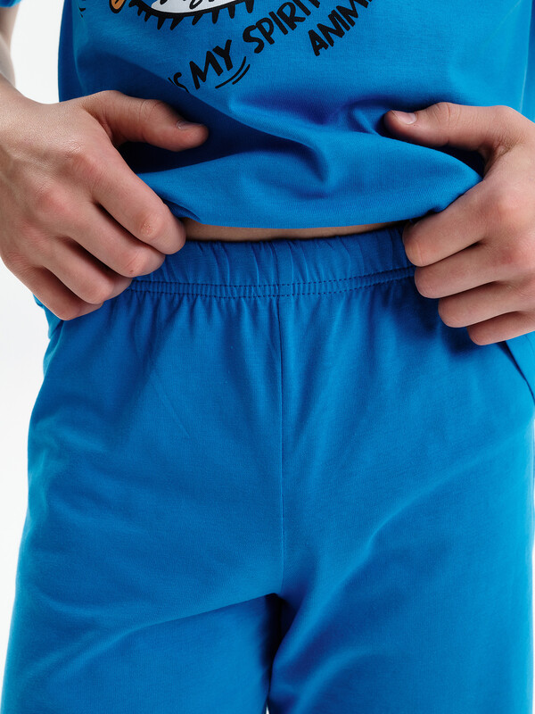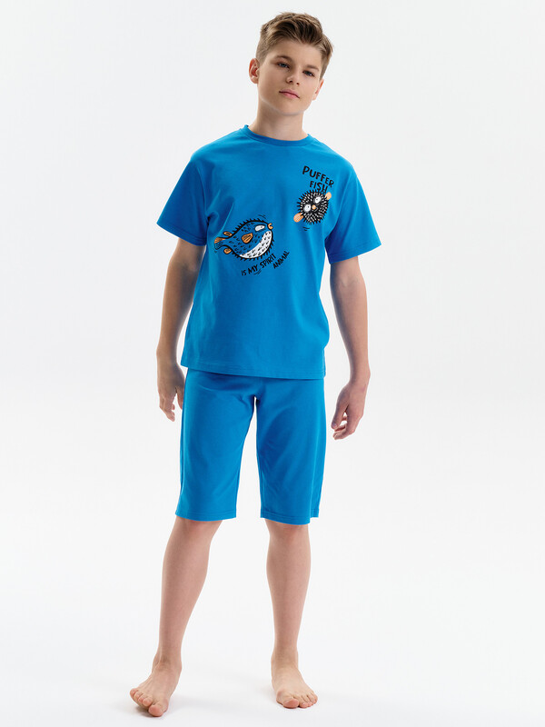 Состав: верх: 100%хлопок, низ: 100%хлопок Стильная и уютная пижама для мальчика. В составе ткани 100% хлопка — идеально для детской домашней одежды! Футболка и удлиненные шорты, плечо спущено, рукава широкие и свободные — пижама на мальчика очень удобна для сна. Широкая и мягкая резинка в поясе шортов не перекручивается и не давит. Отделка горловины из эластичной рибаны — она не растягивается, ребёнку удобно надевать и снимать пижаму. Перевод надписей: "рыба фугу мое тотемное животное" Комментарии к товару