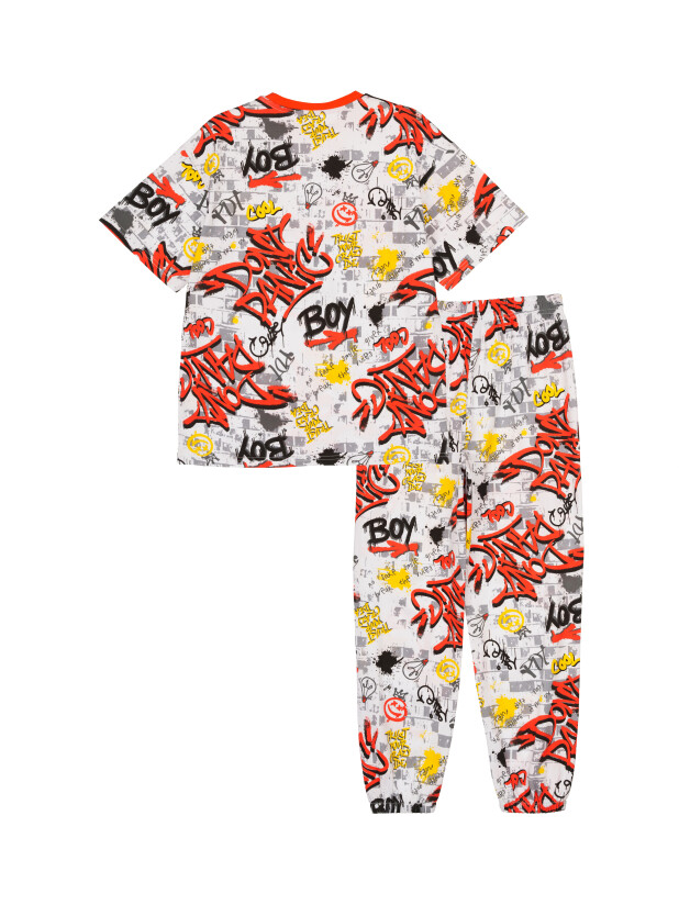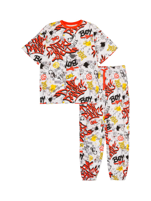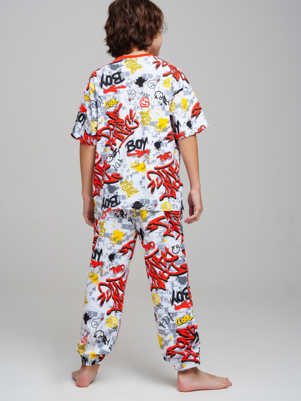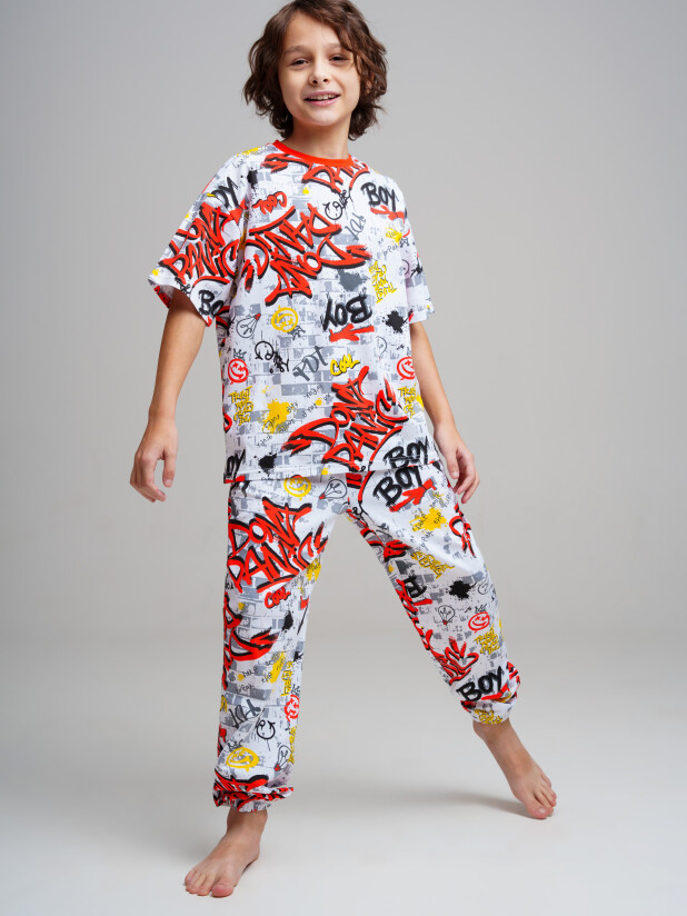 Пижама для мальчика подростка. Футболка и брюки из эластичного и приятного на ощупь трикотажа. Штаны на резинке со шнурком. Высокое содержание хлопка 95%. Благодаря наличию эластана в составе ткани изделие держит форму и меньше мнется.