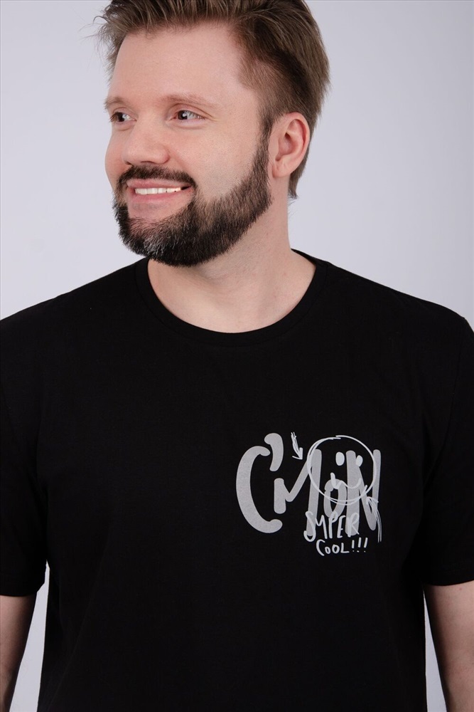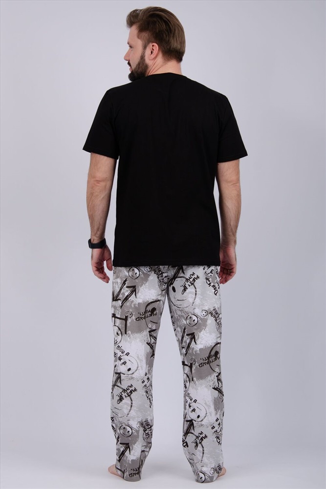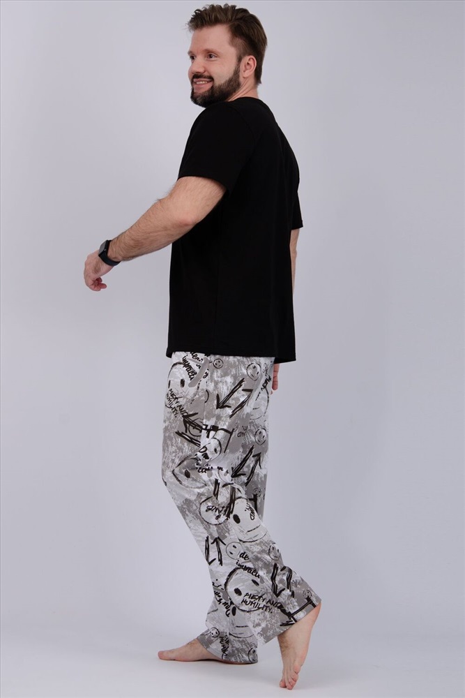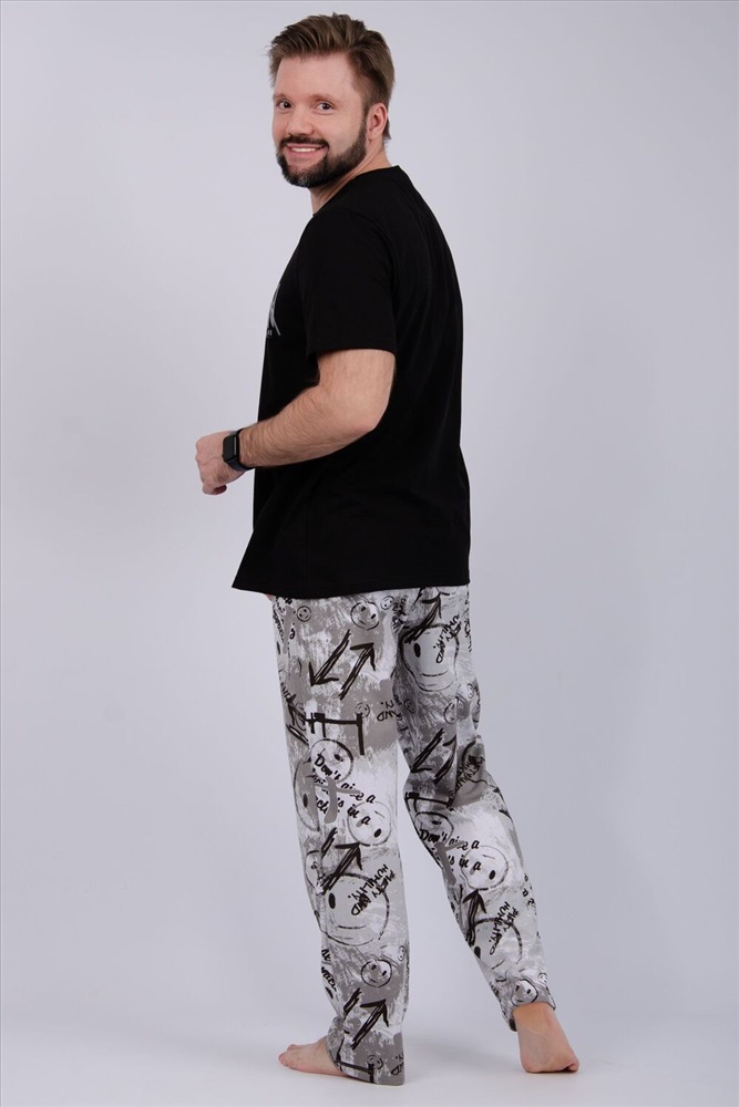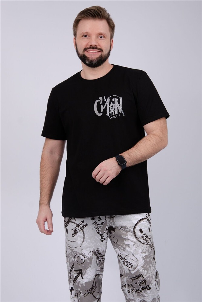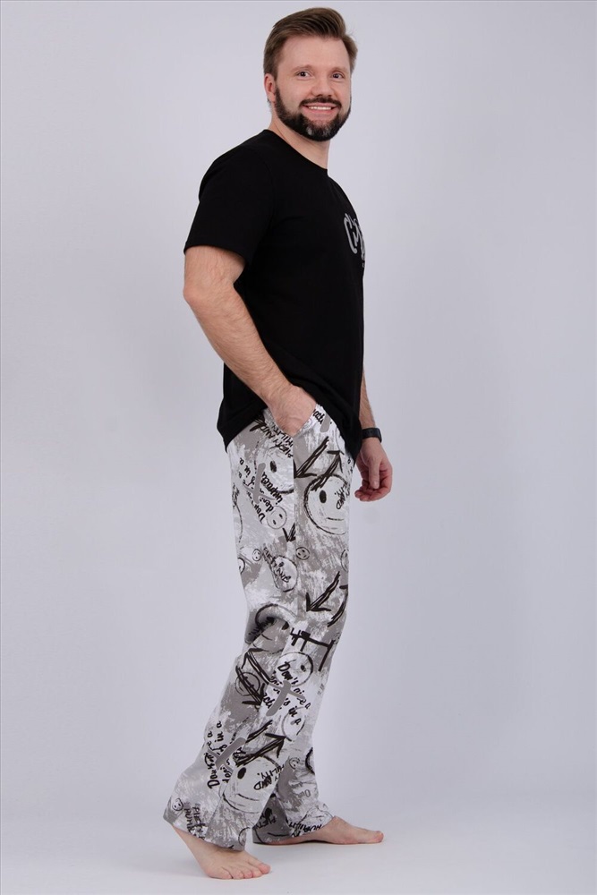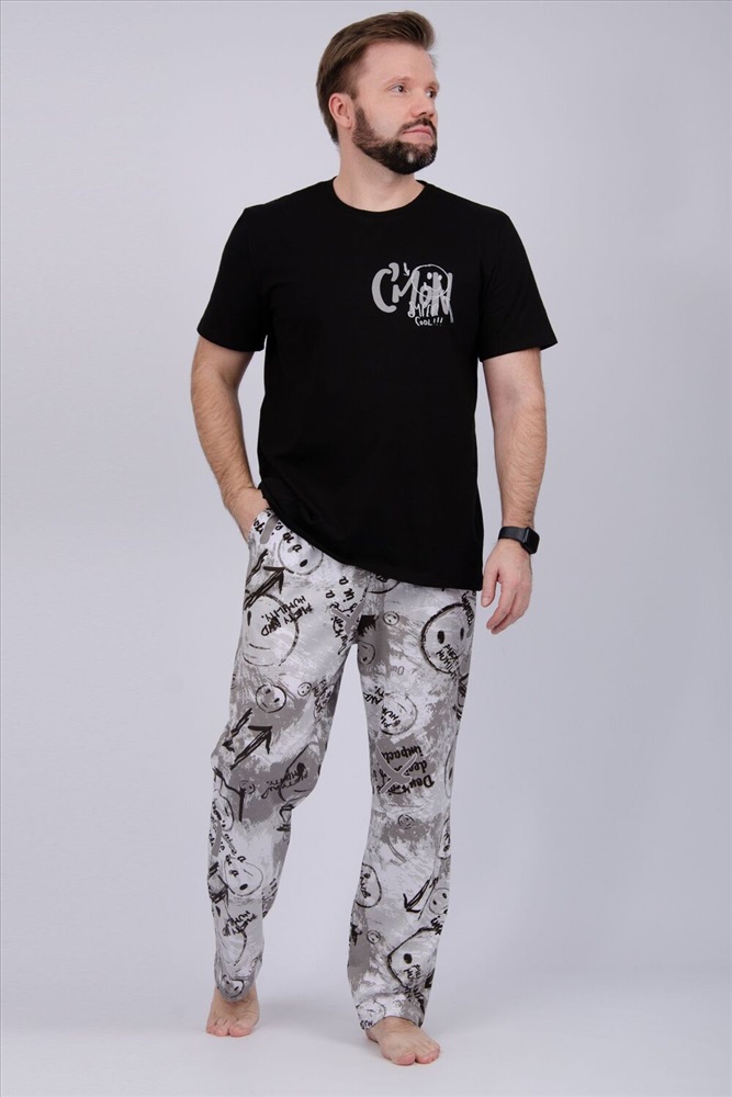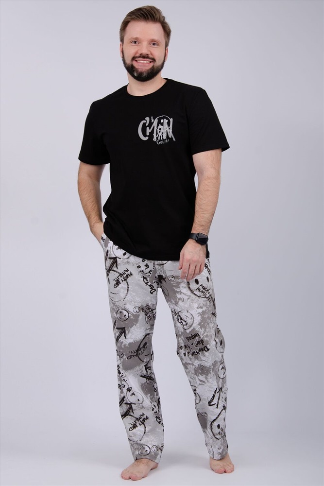 Комфортная мужская пижама из 100% хлопка - брюки с боковыми карманами, на эластичном поясе и футболка с коротким рукавом и стильным принтом на полочке.