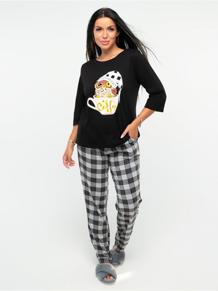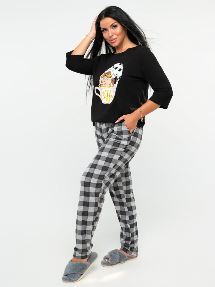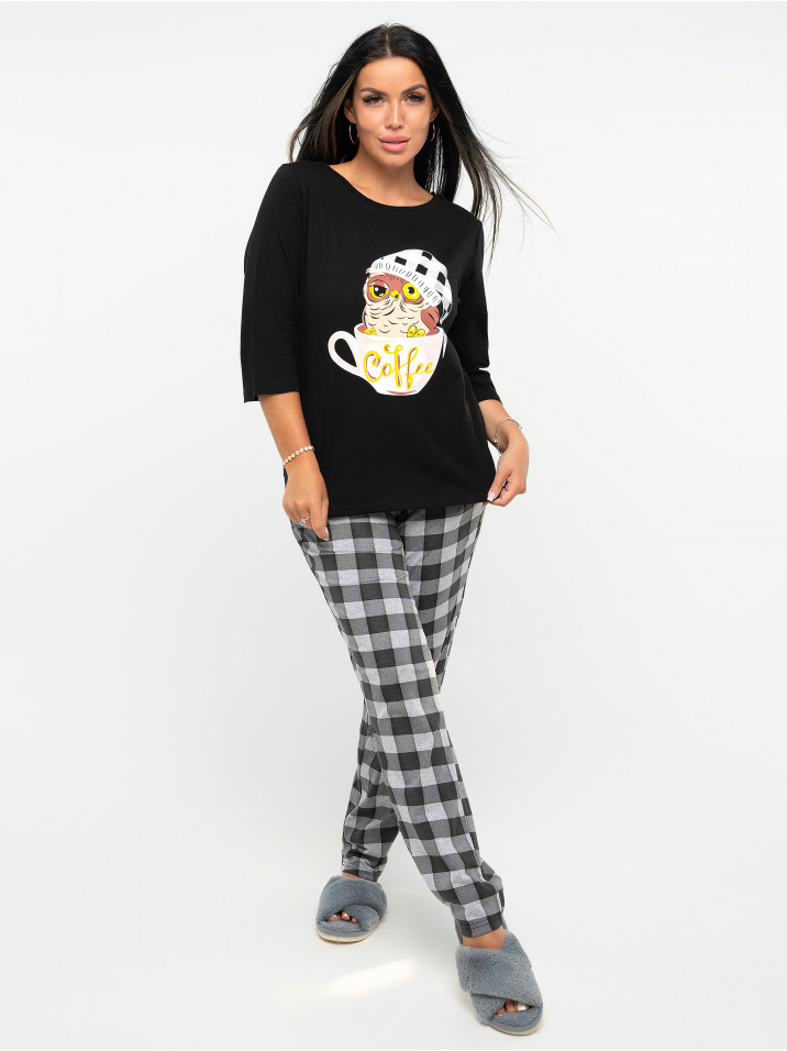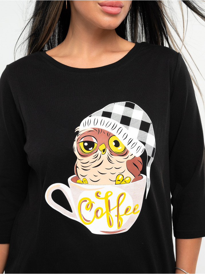Милая пижама с лонгсливом и шортами. Лонгслив свободного кроя с коротким рукавом, с принтом. Шорты удлиненные, свободного кроя, с поясом с резинкой. В такой пижаме ты будешь выглядеть очень мило и интересно.
