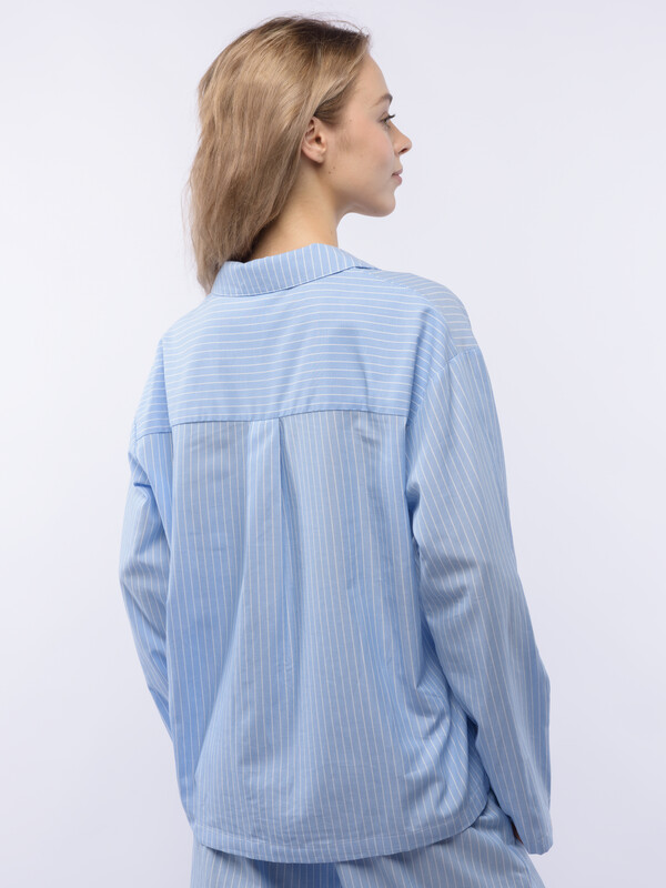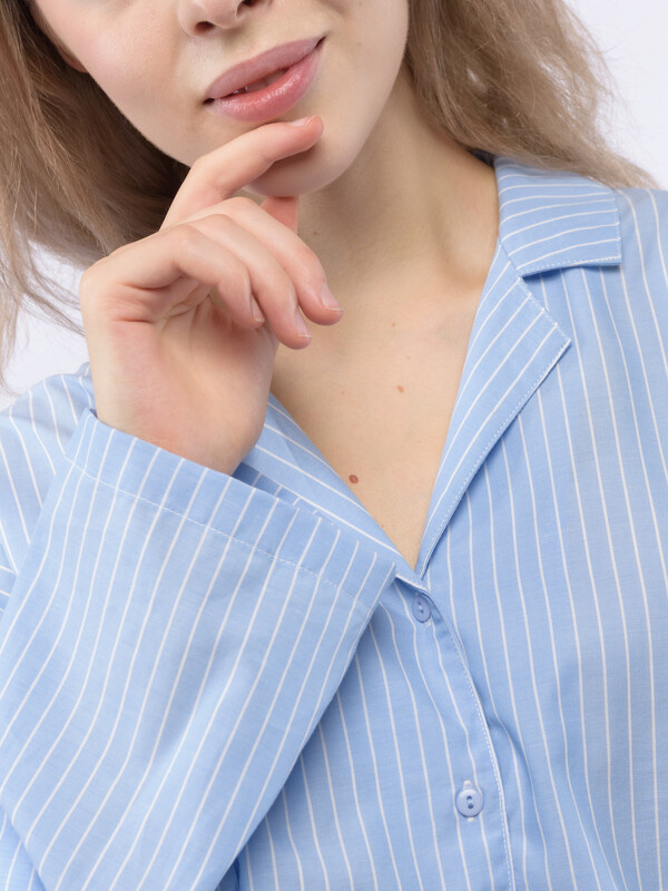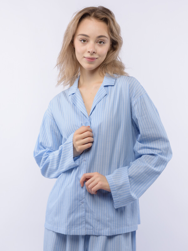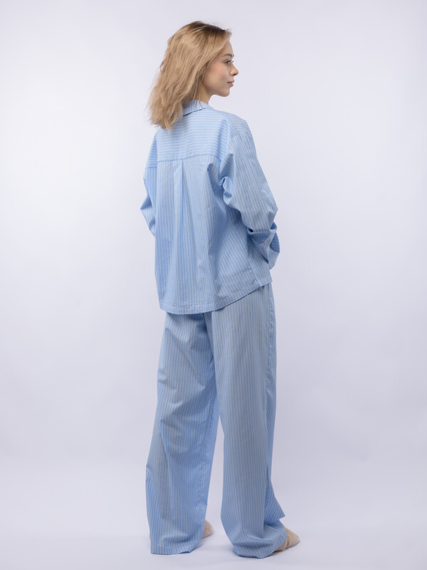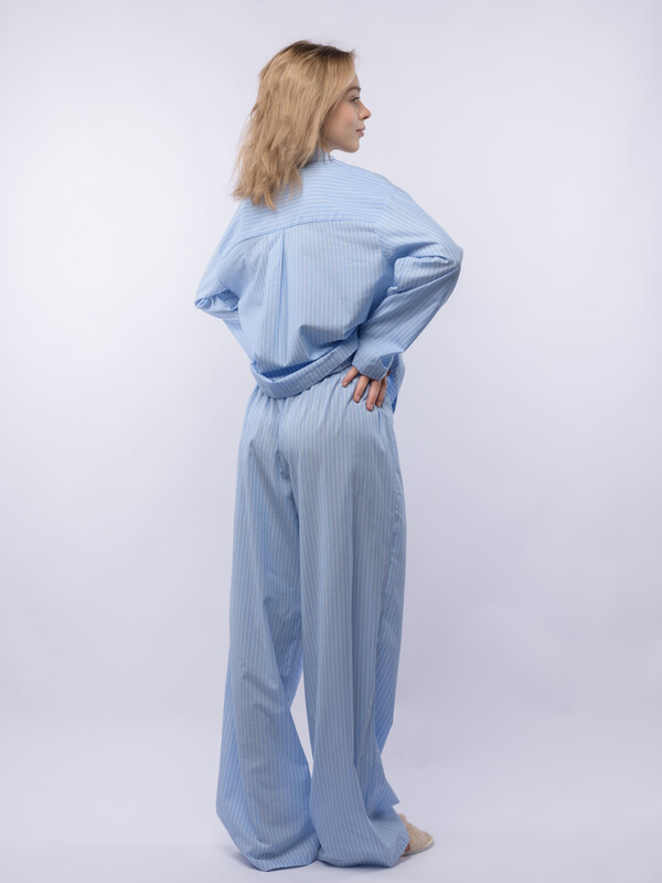 Домашний костюм OVERSIZE из голубого поплина в белую тонкую полоску состоит из рубашки и широких брюк. Рубашка с английским воротником, застежкой на пуговицы и с длинным рукаовм без манжет. Брюки с двойной резинкой : внутренней и внешней принтованной. Подгиб и строчка по низу рукава и рубашки и низу брюк. XS-XS(170-84-90), S-S(170-88-94), M-M(170-92-98), L-L(170-96-102), XL-XL(170-100-106)