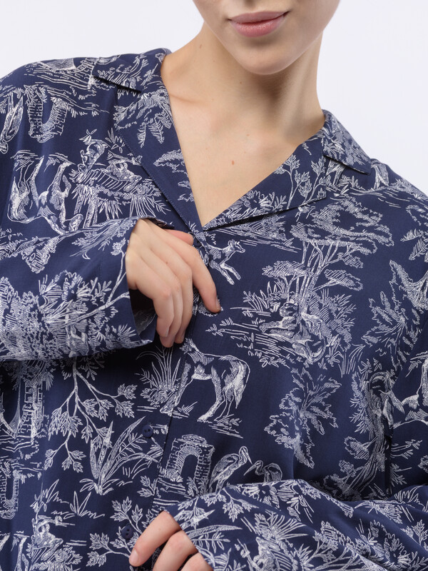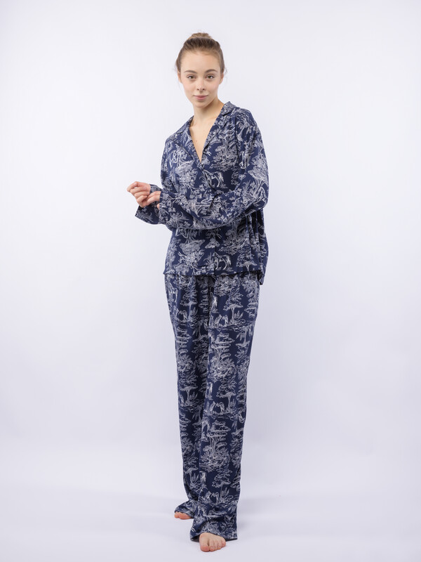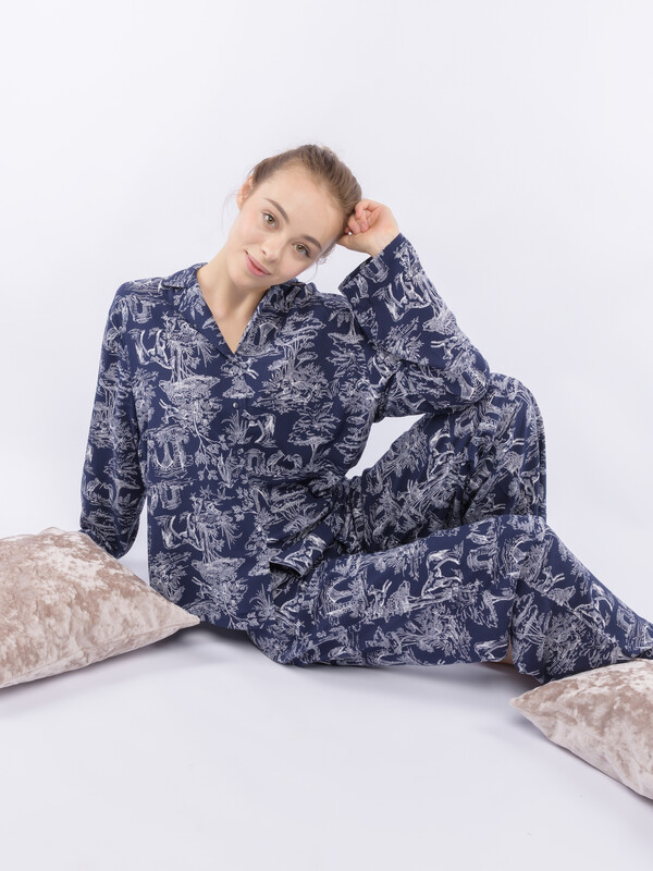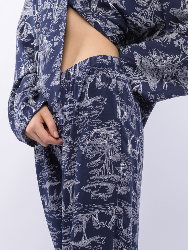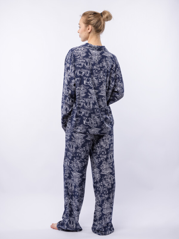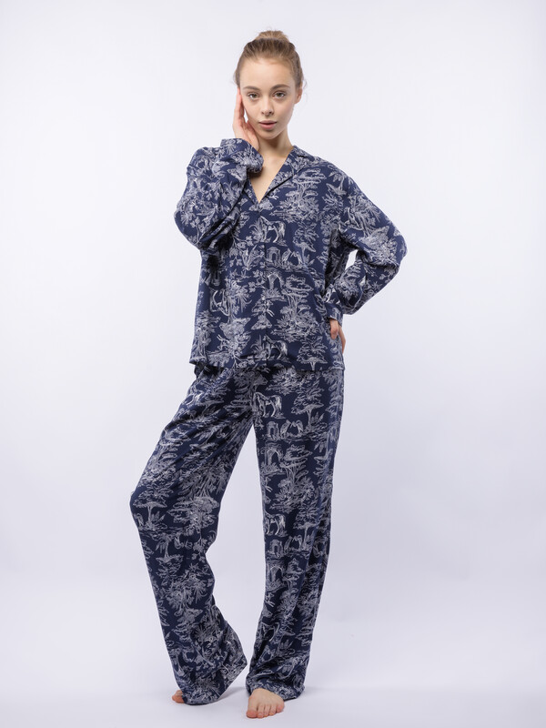 Домашний костюм из тканой вискозы состоит из рубашки и длинных широких брюк. Принт : «Туаль де Жуи» (Toile de Jouy) — это французская ткань с одноцветным рисунком в белых тонах на синем фоне, изображающим пасторальные сцены, пейзажи или сцены из жизни XVIII века. Рубашка с английским воротником, на пуговицах, с длинным рукавом без манжет. Брюки на резинке. Подгиб и строчка по низу рукава и рубашки и низу брюк. XS-XS(170-84-90), S-S(170-88-94), M-M(170-92-98), L-L(170-96-102), XL-XL(170-100-106)