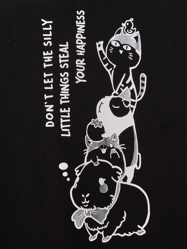 Пижама женская с шортами. В составе ткани преобладает высококачественный хлопок — комплект для сна мягкий, гипоаллергенный и хорошо пропускает воздух. В хлопковой пижаме вам будет комфортно и уютно во время сна. Эластан помогает модели надолго сохранить первоначальную форму. Футболка силуэта оверсайз, плечо спущено, рукава широкие и удлинённые — в пижаме очень удобно спать. В поясе шорт мягкая и широкая резинка — не перекручивается и не давит. Отделка горловины из эластичной рибаны — она не растягивается, пижаму удобно надевать и снимать. Хлопковая пижама украшена милым, «няшным» принтом в виде забавных зверушек с позитивным настроением, надпись переводится: «не позволяй глупым вещам воровать твоё счастье» — почувствуйте себя беззаботной девчонкой. В принте есть модный оттенок — серебритсый металлик. Пижамный костюм неприхотлив в уходе. Принт эластичный и мягкий, легко переносит частые стирки. Милая пижама подходит как для сна, так и просто для отдыха дома, пижамной вечеринки. Помните о правильном уходе за изделием: рекомендуется стирать при температуре не выше 30 °C, без предварительного замачивания, с изнанки. Это поможет сохранить качество и цвет пижамы на длительное время.