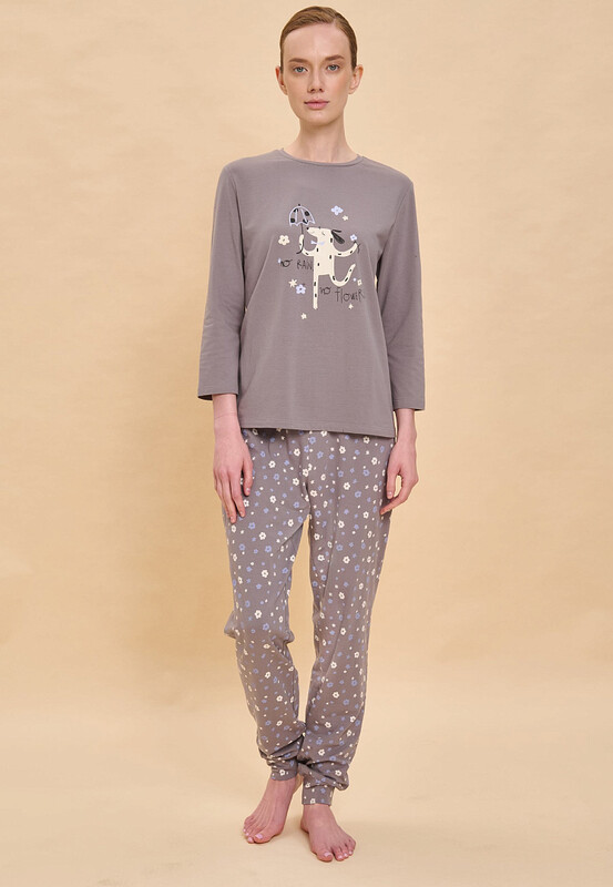 Состав: верх: 95%хлопок 5%эластан, низ: 95%хлопок 5%эластан Костюм пижамный женский. В составе ткани преобладает высококачественный хлопок — комплект для сна мягкий, гипоаллергенный и хорошо пропускает воздух. В хлопковой пижаме вам будет тепло и уютно во время сна. Эластан помогает модели надолго сохранить первоначальную форму. Джемпер и брюки умеренного объёма, плечо немного спущено, рукава широкие и свободные — в пижаме очень удобно спать. В поясе брюк мягкая и широкая резинка — не перекручивается и не давит. Отделка горловины из эластичной рибаны — она не растягивается, пижаму удобно надевать и снимать. Манжеты брючин широкие, из основной ткани — не передавливают ногу. Хлопковая пижама украшена милым, «няшным» принтом в виде танцующей собачки с зонтиком, надпись переводится: «нет дождя — нет цветов» — поймайте позитивное настроение! Пижамный костюм неприхотлив в уходе. Принт мягкий и прочный, без проблем переносит многочисленные стирки. Пижама женская с брюками подходит как для сна, так и просто для отдыха дома. Помните о правильном уходе за изделием: рекомендуется стирать при температуре не выше 30 °C, без предварительного замачивания, с изнанки. Это поможет сохранить качество и цвет пижамы на длительное время. Не забывайте о выборе правильного размера. Используйте таблицу размеров на фотографии, чтобы выбрать подходящий для себя вариант. Обратите внимание, что цвет товара на экране вашего устройства может отличаться от реального. Комментарии к товару