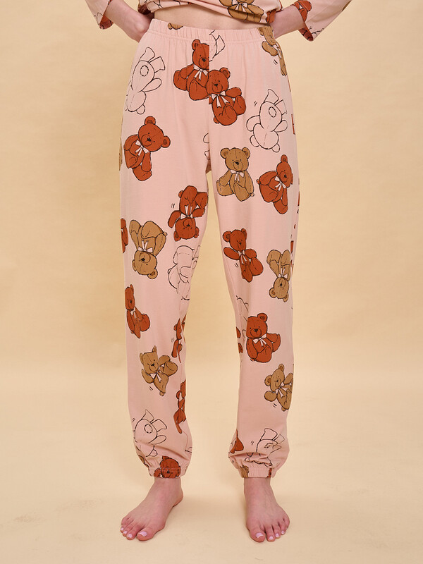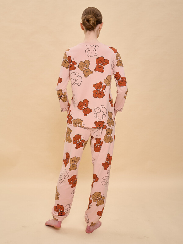 Костюм пижамный женский. В составе ткани преобладает высококачественный хлопок — комплект для сна мягкий, гипоаллергенный и воздухопроницаемый. В хлопковой пижаме вам будет тепло и уютно во время сна. Эластан помогает модели надолго сохранить первоначальную форму. Джемпер и брюки умеренного объёма, плечо немного спущено, рукава широкие и свободные — в пижаме очень удобно спать. В поясе и по низу брюк мягкие и широкие резинки — не перекручиваются и не давят. Отделка горловины из эластичной рибаны — она не растягивается, пижаму удобно надевать и снимать.  Хлопковая пижама украшена милым, «няшным» сплошным принтом в виде плюшевых медвежат — побалуйте своего внутреннего ребёнка. Пижамный костюм неприхотлив в уходе. Принты мягкие и стойкие, без проблем переносят частые стирки. Пижама женская с брюками подходит как для сна, так и просто для отдыха дома, пижамной вечеринки. Помните о правильном уходе за изделием: рекомендуется стирать при температуре не выше 30 °C, без предварительного замачивания, с изнанки. Это поможет сохранить качество и цвет пижамы на длительное время.